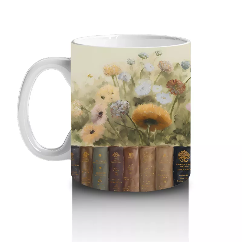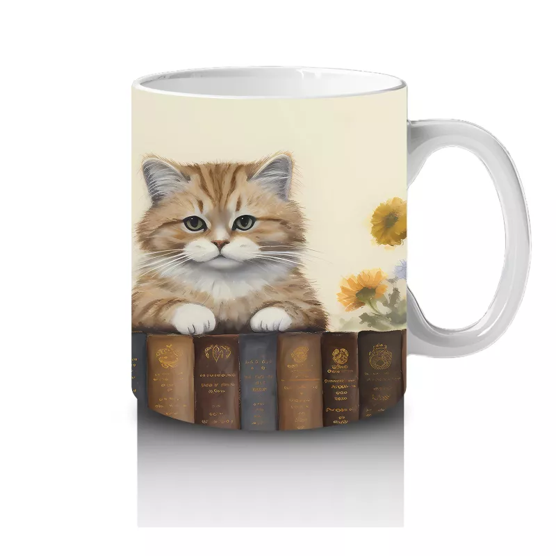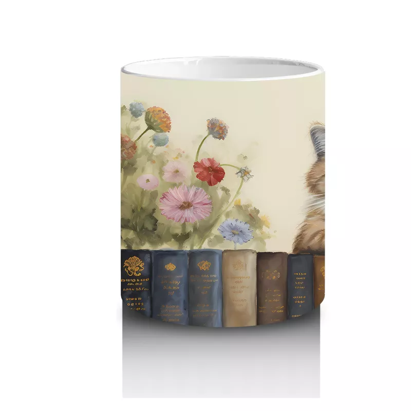 Çiçeklerle çevrili bir kitaplık üzerinde keyifle oturan kedi, sakinliği ve doğa sevgisini bir arada sunuyor. Estetik detaylarla dolu, huzur veren bir kupa alternatifi.