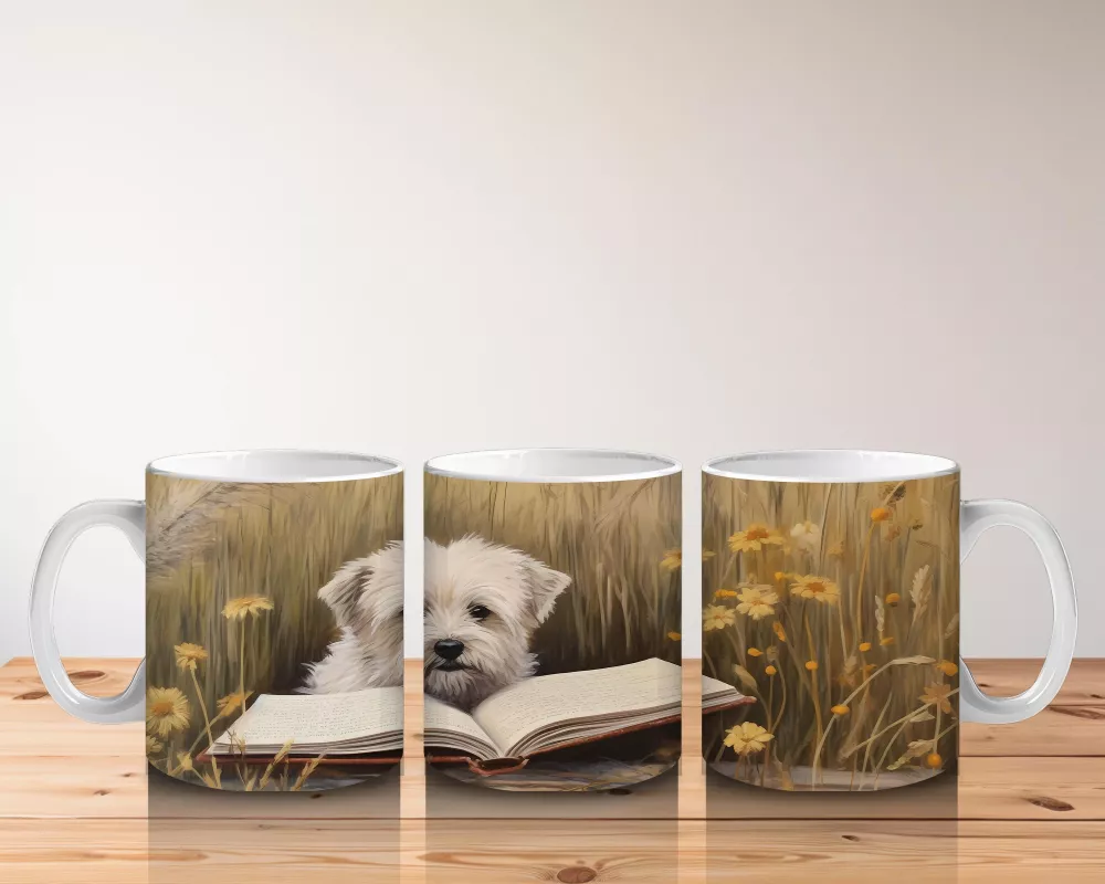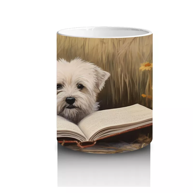 Açık Kitap Üzerinde Oturan Gözlüklü Yavru Köpek – Baskılı Kahve Kupası