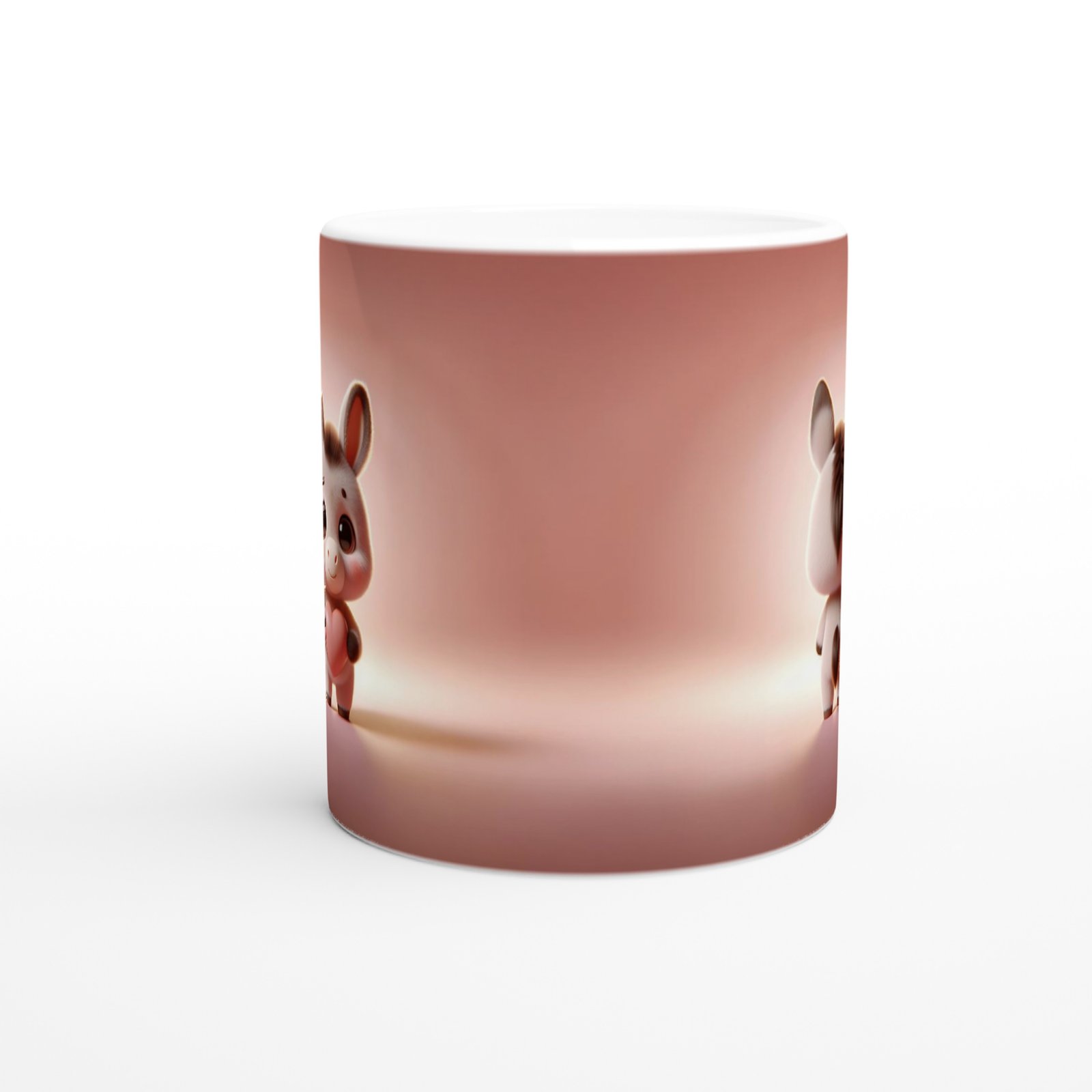 Kalp Tutan Sevimli Oyuncak Eşek Temalı Baskılı Kupa Bardak, pastel pembe arka plan ve kalp figürüyle öne çıkan sevimli tasarımıyla özellikle çocuklara ve sevimli karakter sevenlere hitap eder. İki yönlü görünümüyle hem ön hem arka detaylarıyla dikkat çeker.