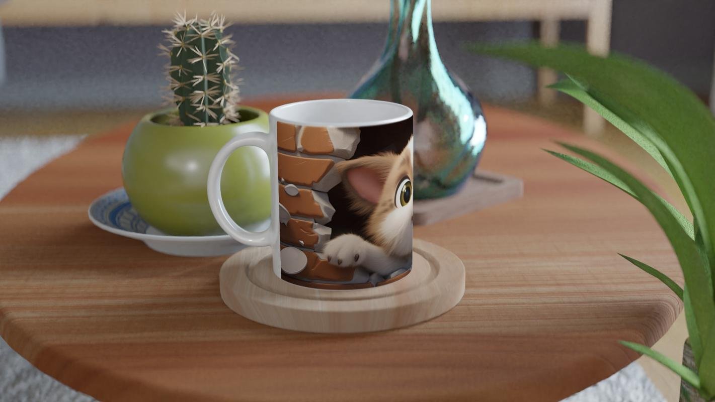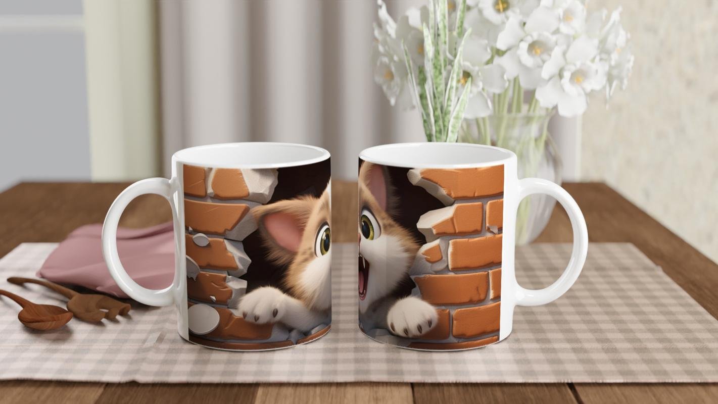 Tuğla Duvarı Yaran Oyuncu Kedi Temalı Baskılı Kupa Bardak, kırılmış tuğla duvarın arasından çıkıveren meraklı ve enerjik kedi figürüyle dikkat çekiyor. Sevimliliğiyle gülümseten bu tasarım, kedi severlerin favorisi olacak.