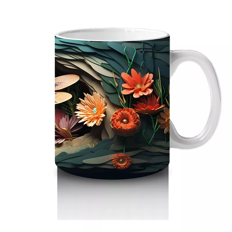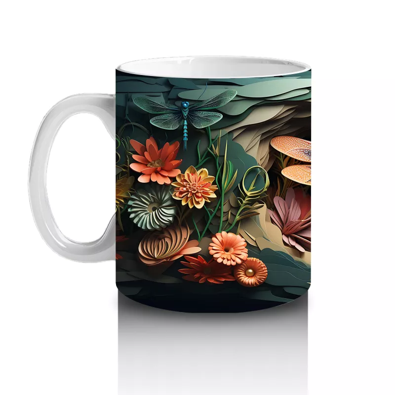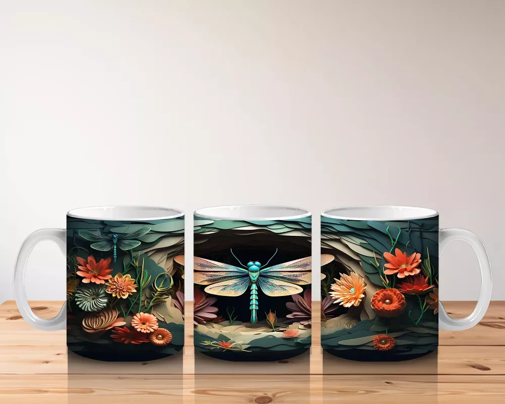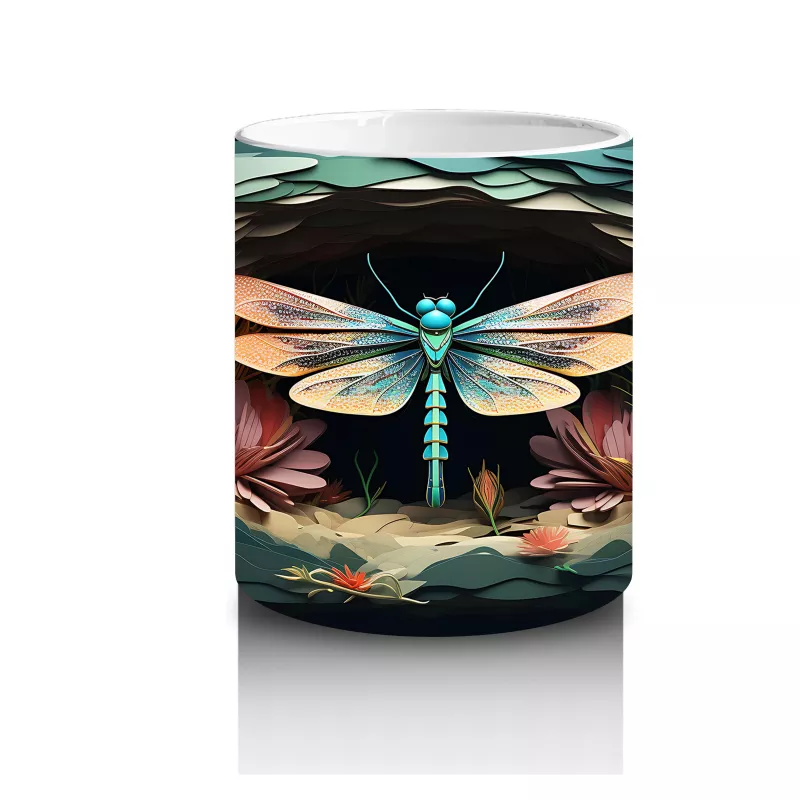 Turuncu çiçeklerin arasından zarafetle süzülen ışıltılı yusufçuk, bu kupada doğanın huzurunu taşır. Sakinleştirici ve estetik bir detay arayanlara özel.