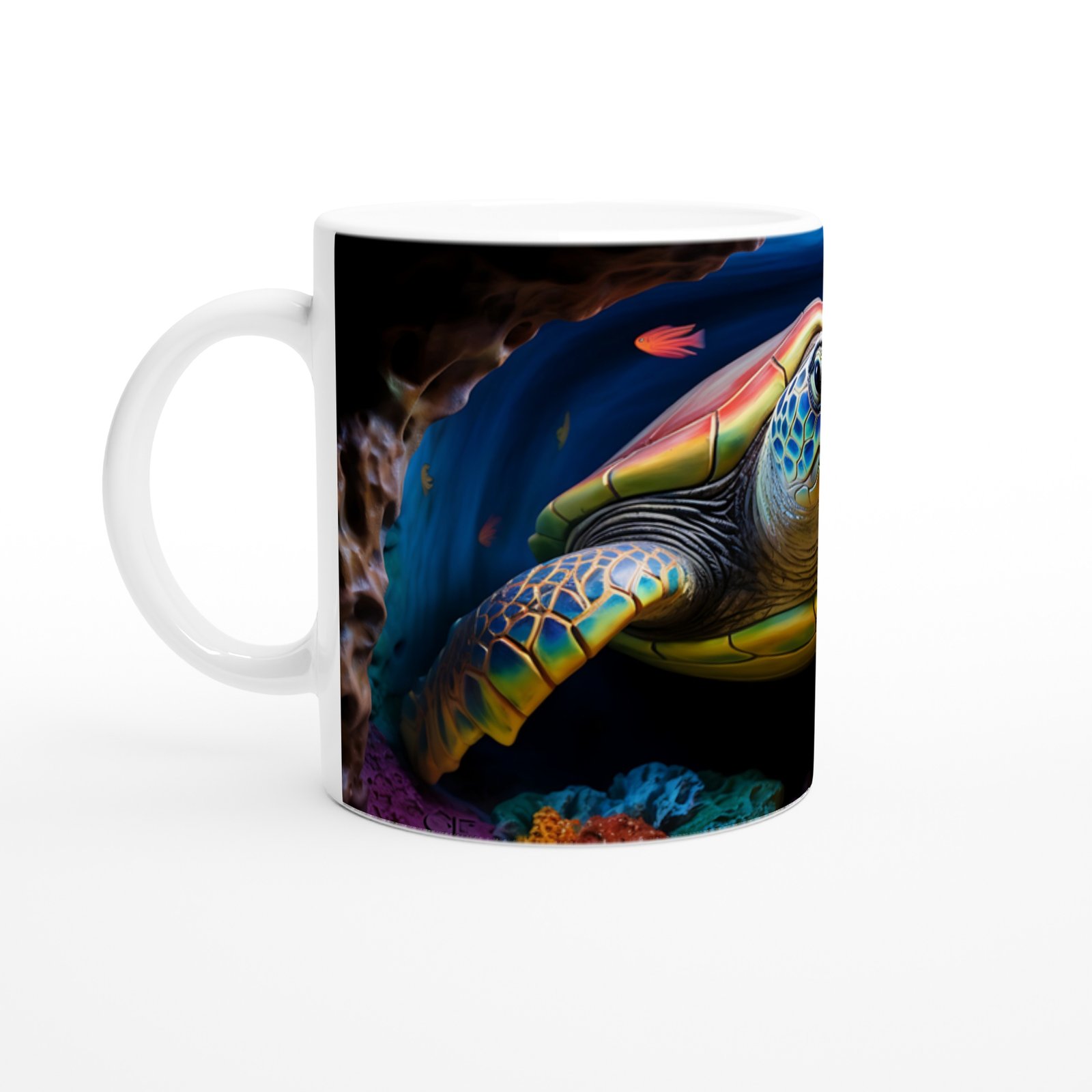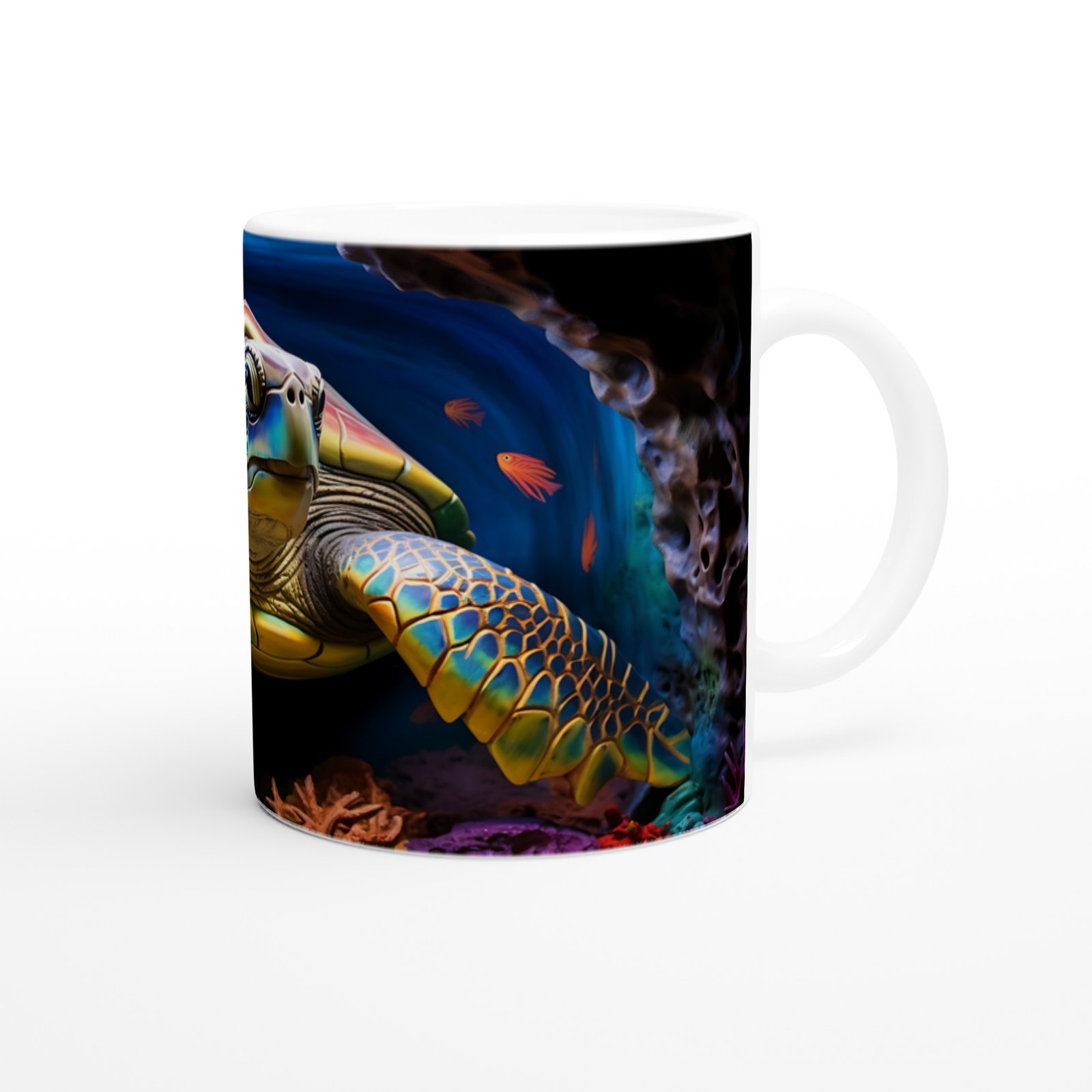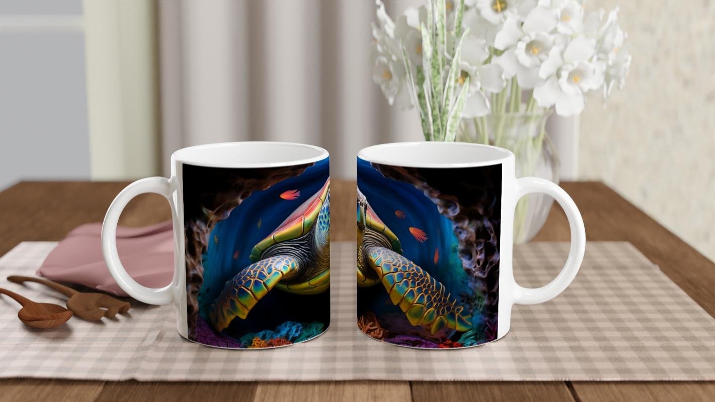 Derin deniz mavisinin içinde yüzen renkli kaplumbağayla süslenmiş bu özel kupa bardak, içecek keyfinizi görsel bir şölene dönüştürüyor.