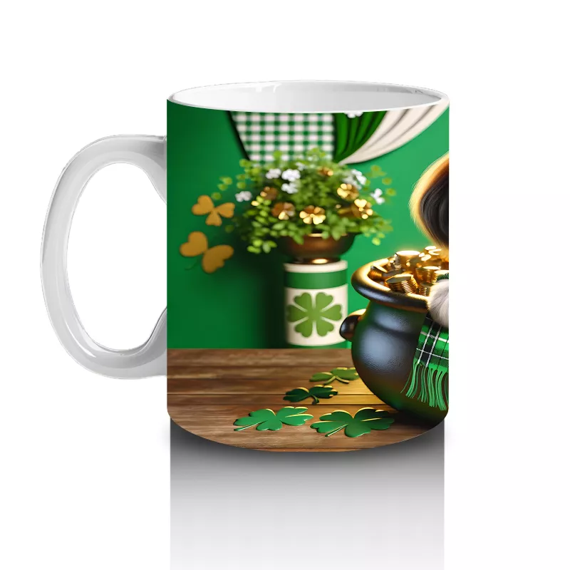 Altınlarla dolu kazanın içinde oturan St. Patrick’s temalı Beagle, şans ve neşeyi simgeliyor. Parlak ve tematik tasarımlar arayanlar için özel bir kupa.