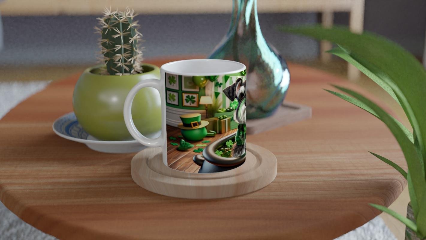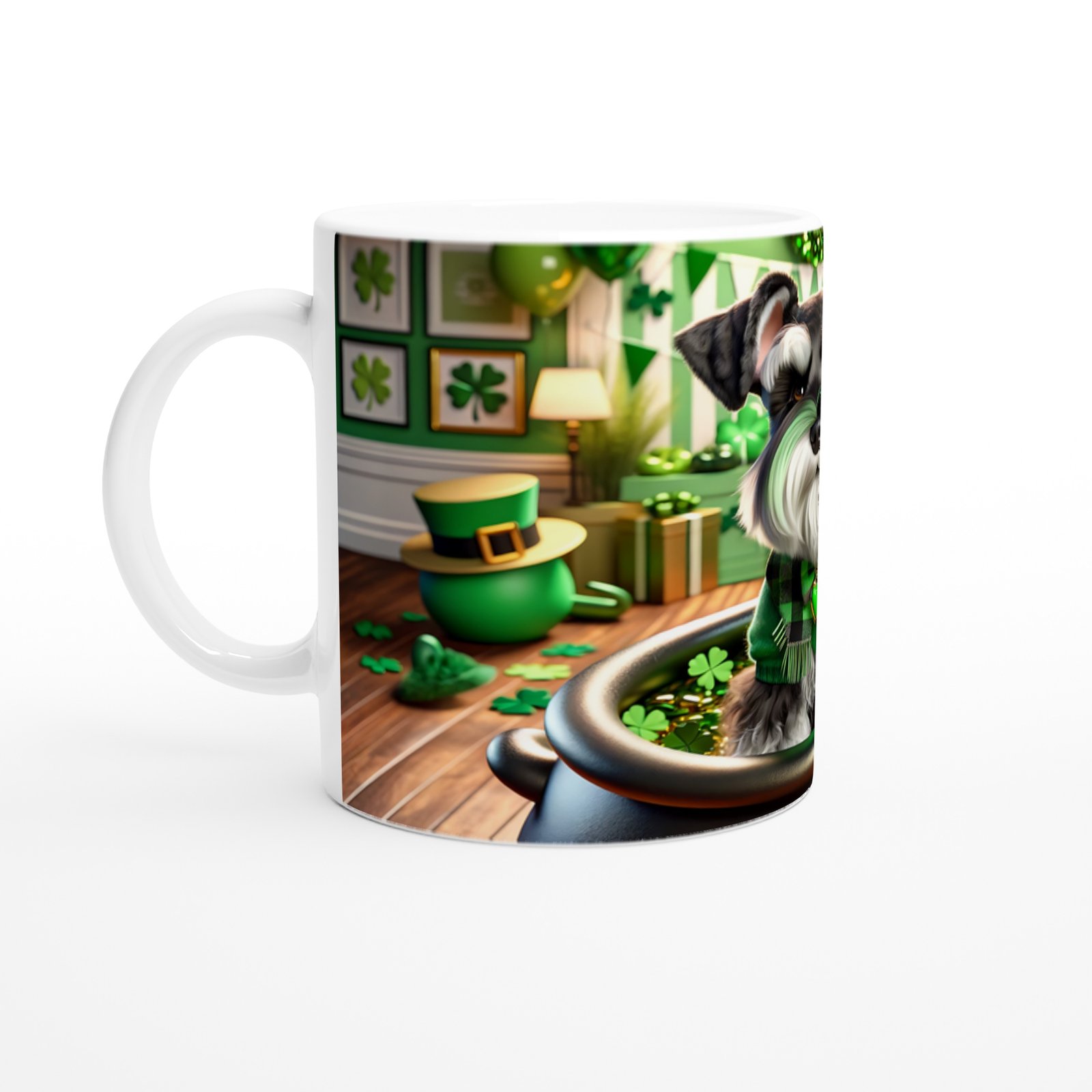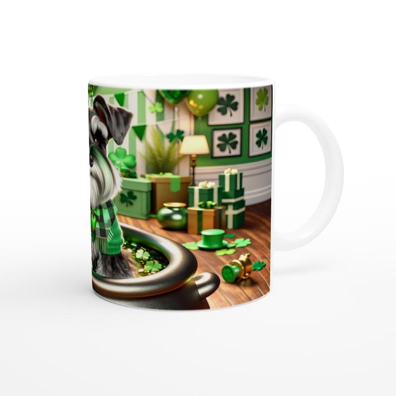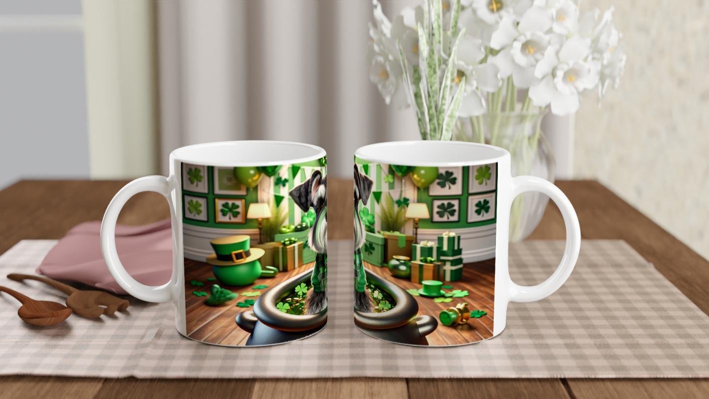 St. Patrick Temalı Schnauzer Köpek Baskılı Kupa Bardak, altın dolu kazan içinde oturan minik dostumuz, kalpli kolyesi ve şans yoncalarıyla dolu ortamıyla şansın, sadakatin ve kutlamanın simgesi oluyor. Hem köpek severlere hem de temalı koleksiyonlara hitap eden özel bir ürün.