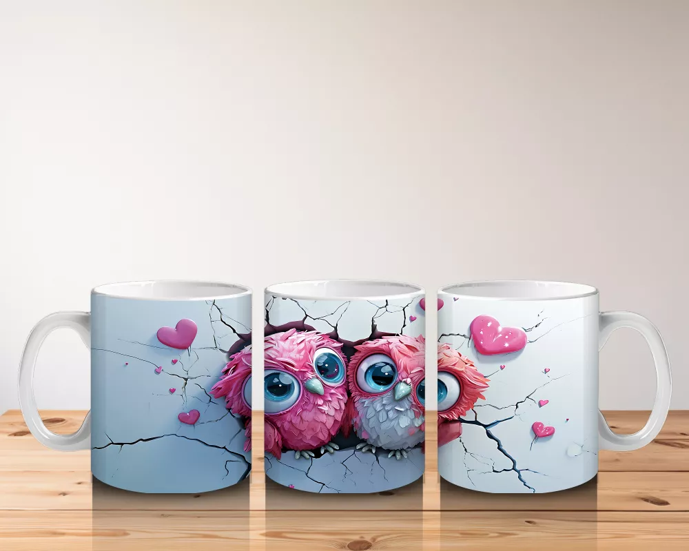 Pembe Kalplerle Süslenmiş Baykuşlar – Baskılı Kahve Kupası