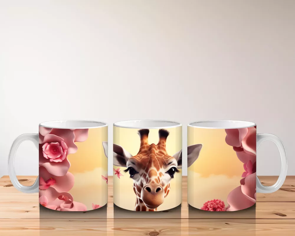 Pembe Çiçekler Arasında Sevimli Zürafa – Baskılı Kahve Kupası