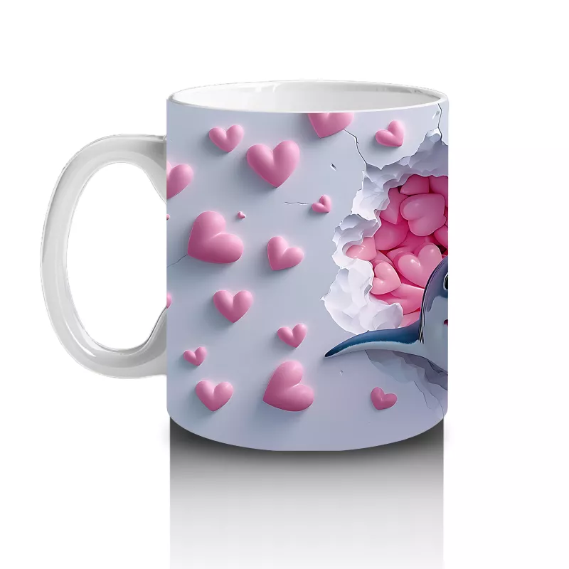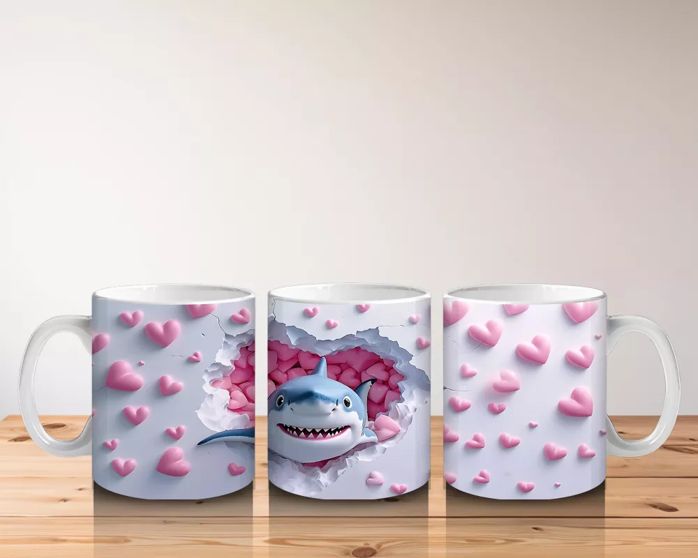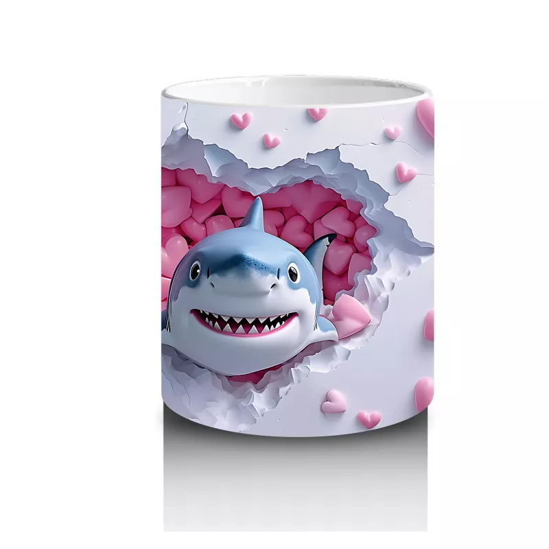 Sevimliliğiyle şaşırtan bir köpek balığı, pembe kalpler arasında yumuşak bir tebessümle bakıyor. Hem eğlenceli hem tatlı bir atmosfer için harika bir tercih.