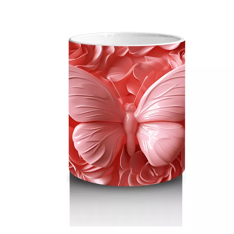 Renkli gül buketinin arasında uçuşan pembe kelebek, zarif ve romantik bir kompozisyon oluşturuyor. Doğal güzellikleri ve yumuşak renkleri sevenler için estetik bir kupa seçeneği.