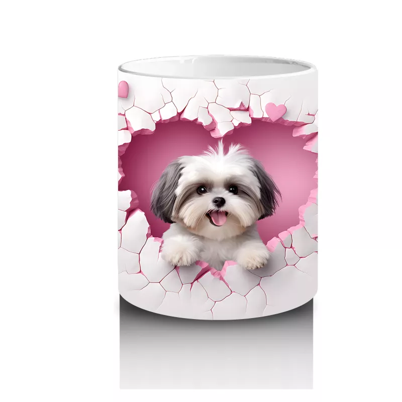 Pembe kalplerle çevrili yavru köpek figürü, sevgi ve neşeyle dolu sıcak bir atmosfer yaratıyor. Sevimli ve içten tasarımlardan hoşlananlar için özel bir kupa.