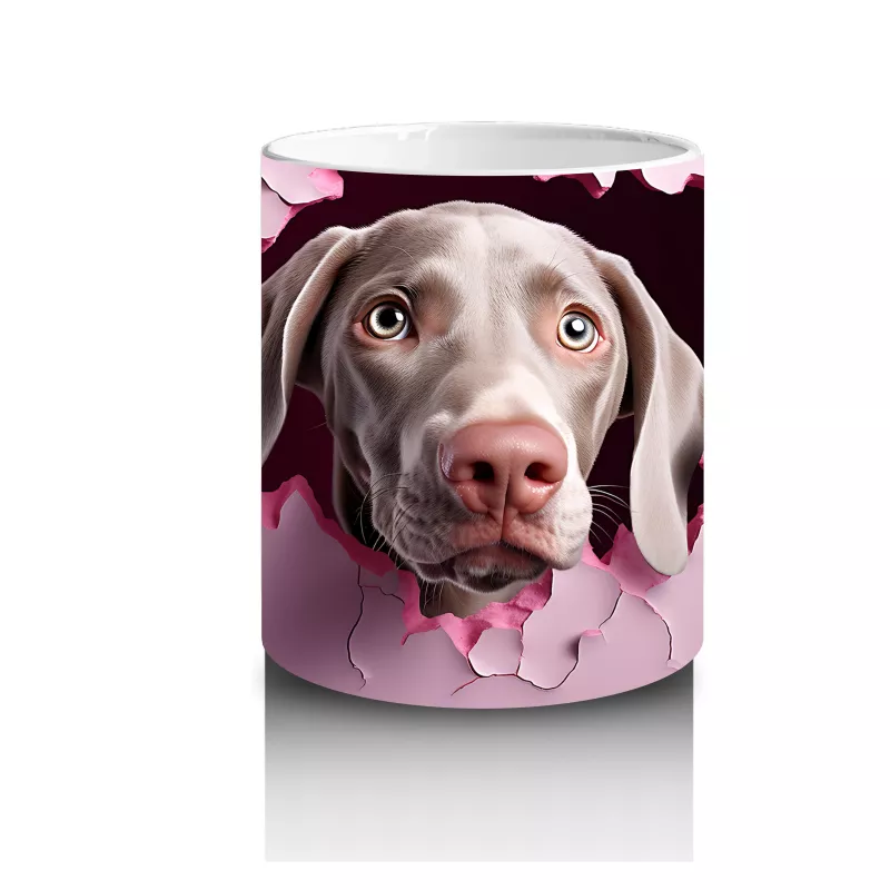 Pembe kalplerle süslenmiş duvar önünde duran sevimli köpek, tatlı ve neşeli bir görüntü sunuyor. Romantik ve içten detayları arayanlar için ideal bir kupa.