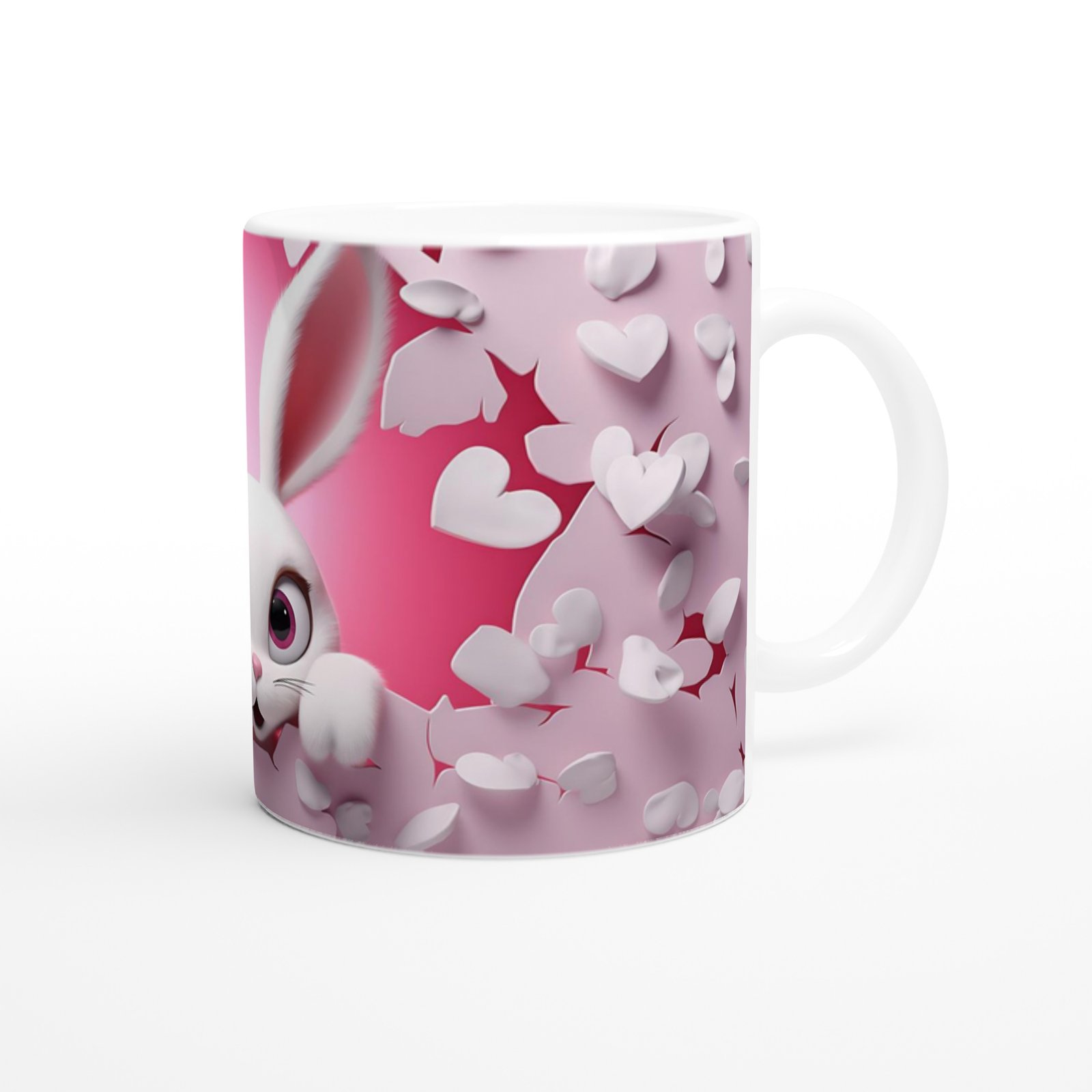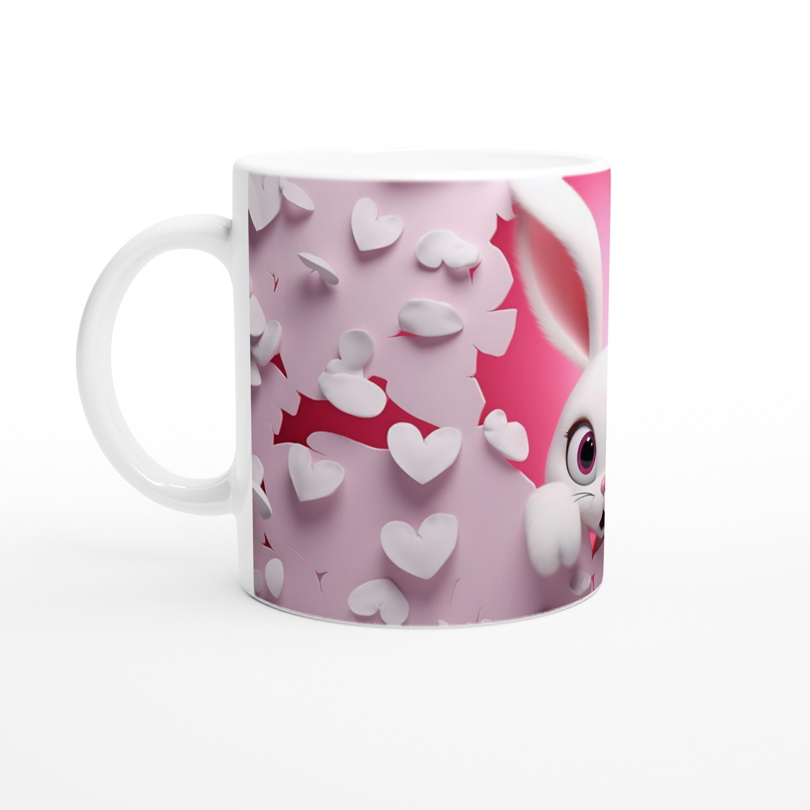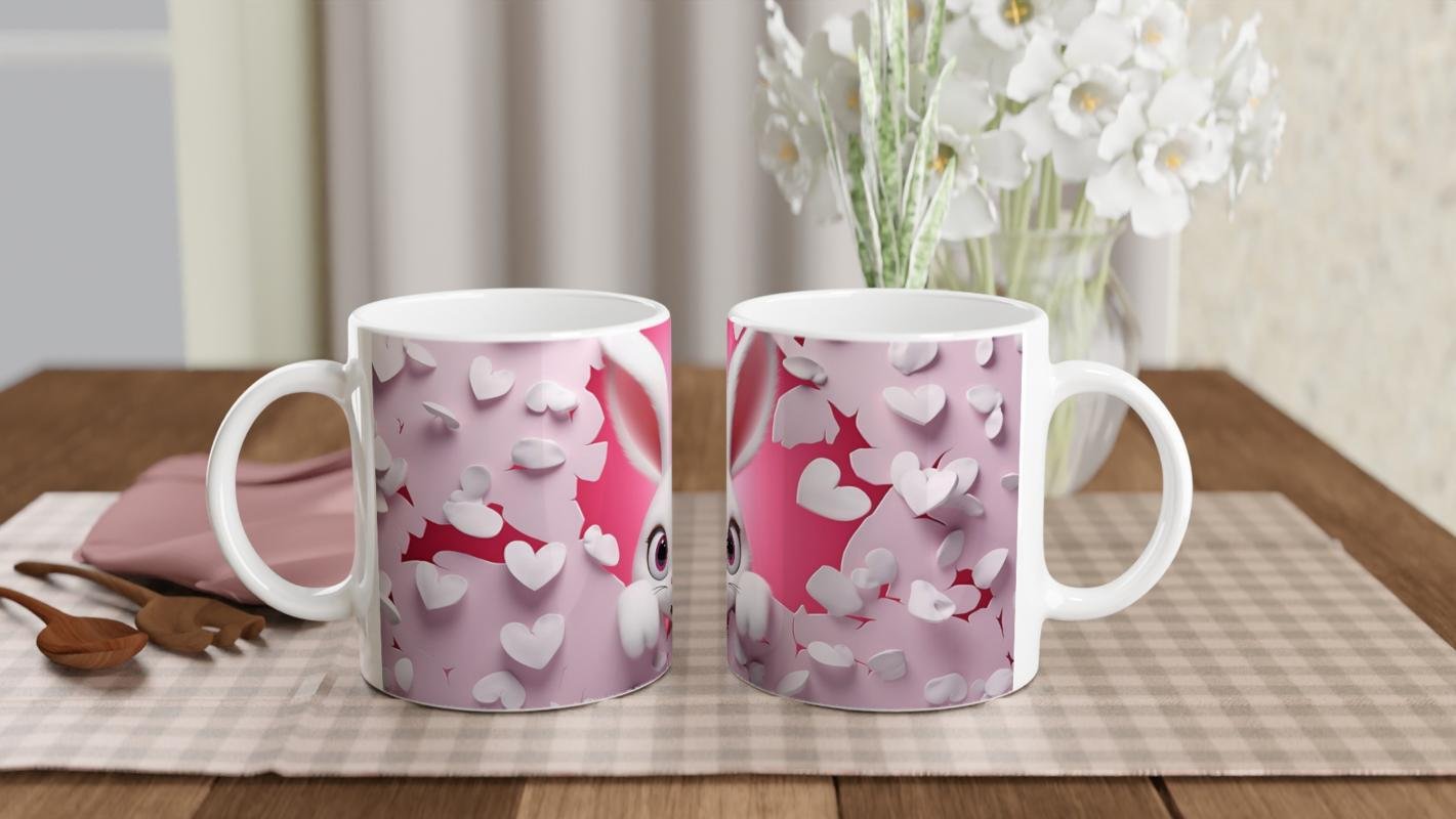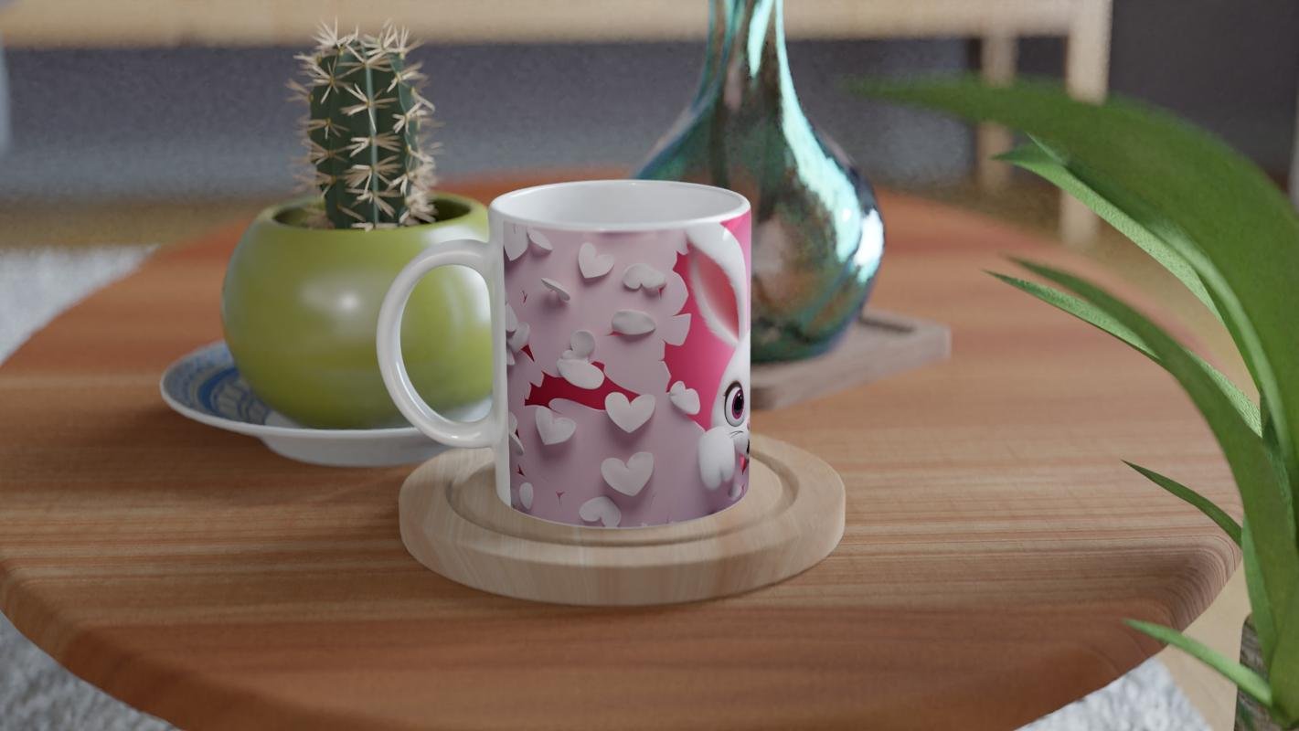 Pembe Kalpli Duvardan Bakan Tavşan Temalı Baskılı Kupa Bardak, uçuşan beyaz kalpler ve kırık duvar efektiyle enerjik ve sevgi dolu bir atmosfer sunuyor. Çocuklara özel hediyelikler arasında öne çıkıyor.