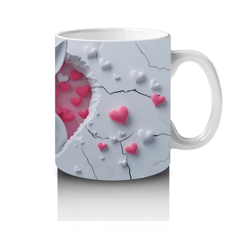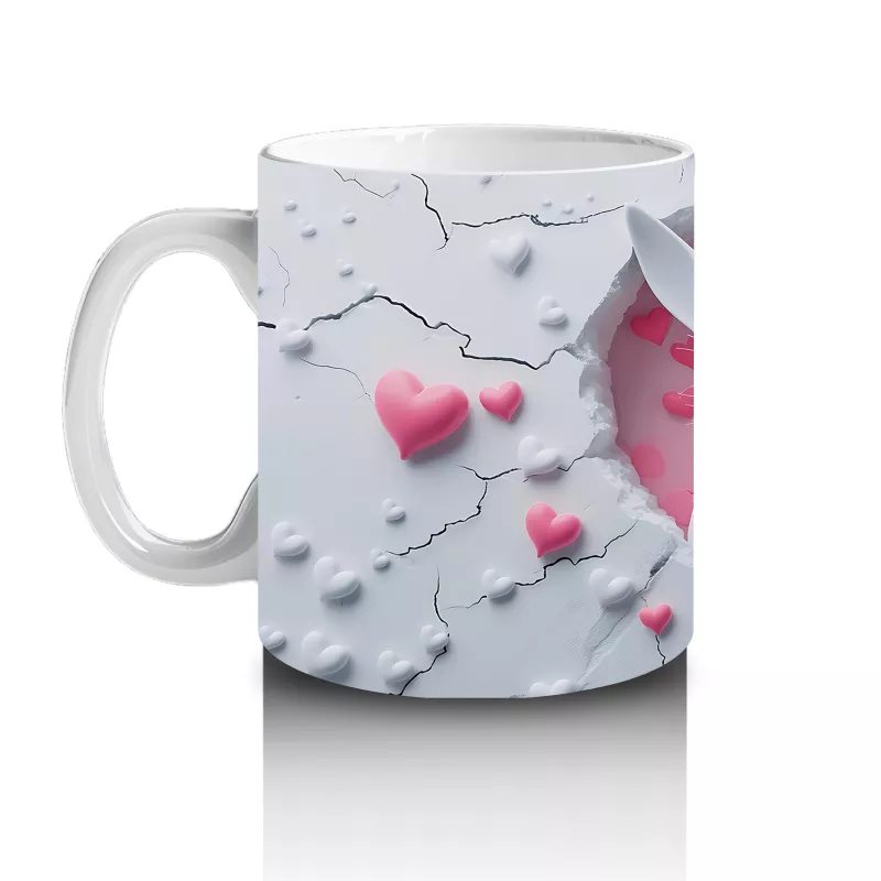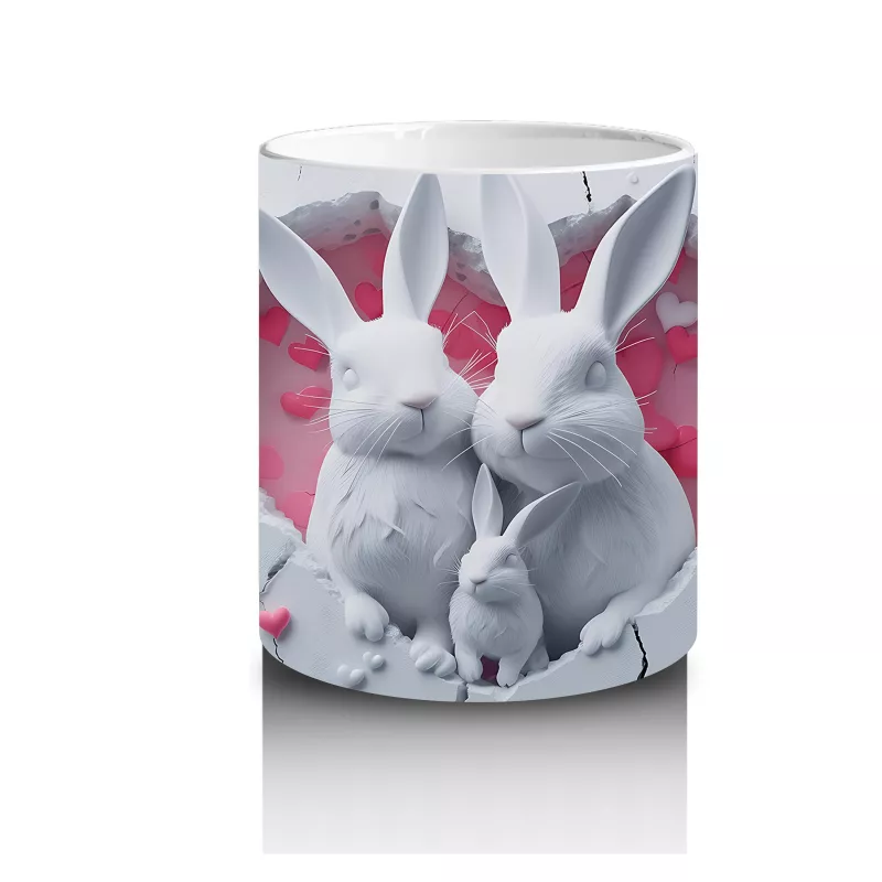 Aşk dolu pembe kalplerin arasında tatlı tavşanlar! Bu romantik ve neşeli kupa, hem çocuklar hem de hayvansever yetişkinler için harika bir seçim.