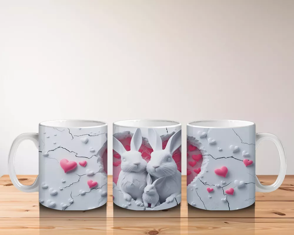 Pembe Kalplerle Süslenmiş Sevimli Tavşanlar – Baskılı Kahve Kupası