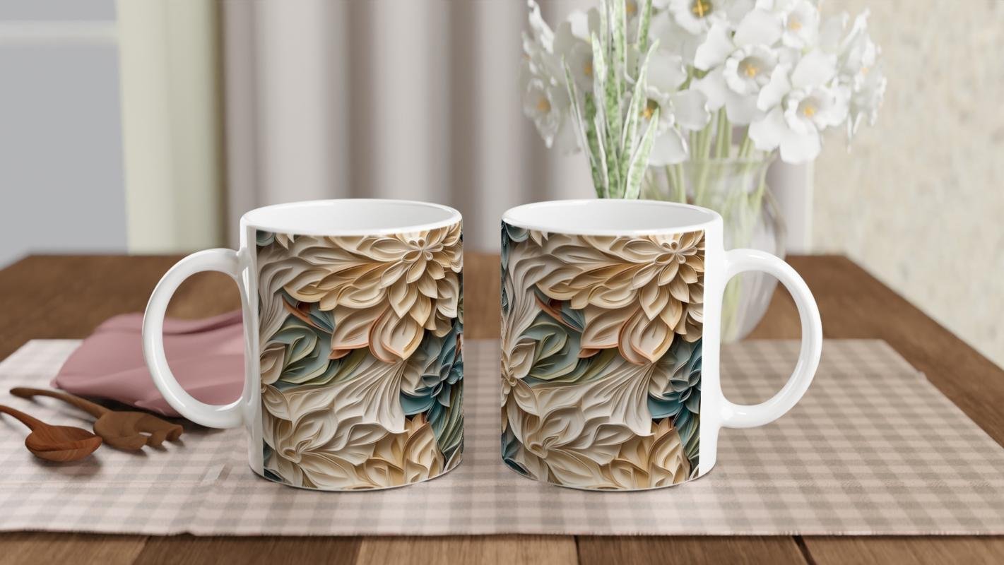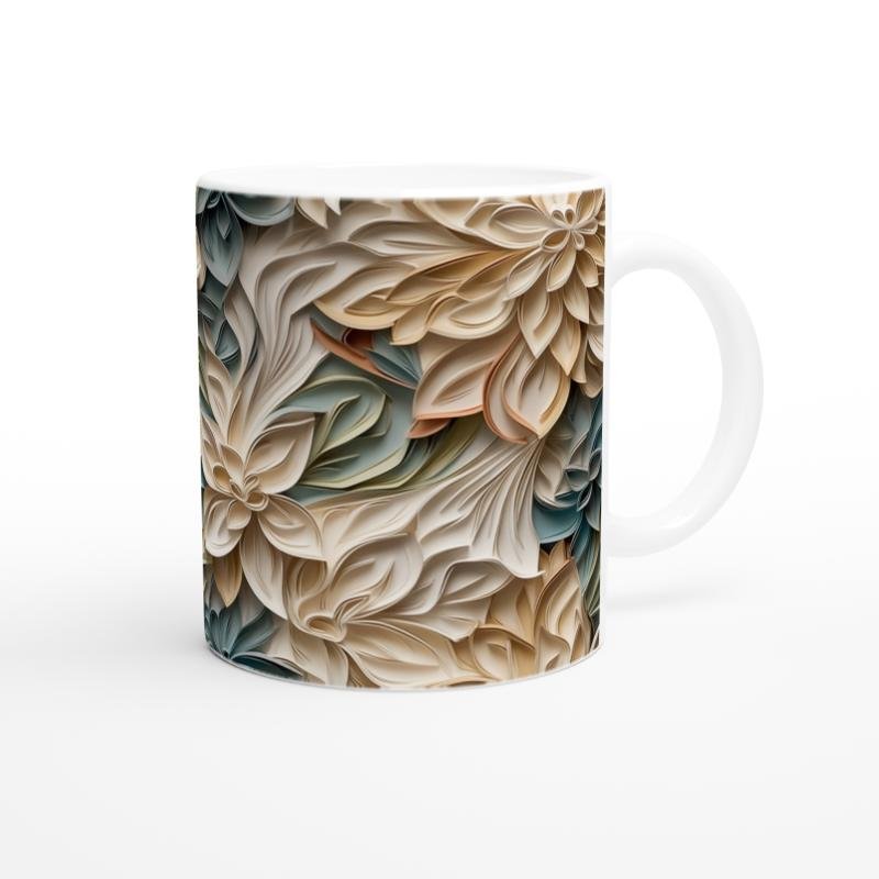 Bej, yeşil ve turuncu tonlarda katmanlı yaprak formlarıyla süslenen bu desenli kupa bardak, sanatsal bir estetik sunar.