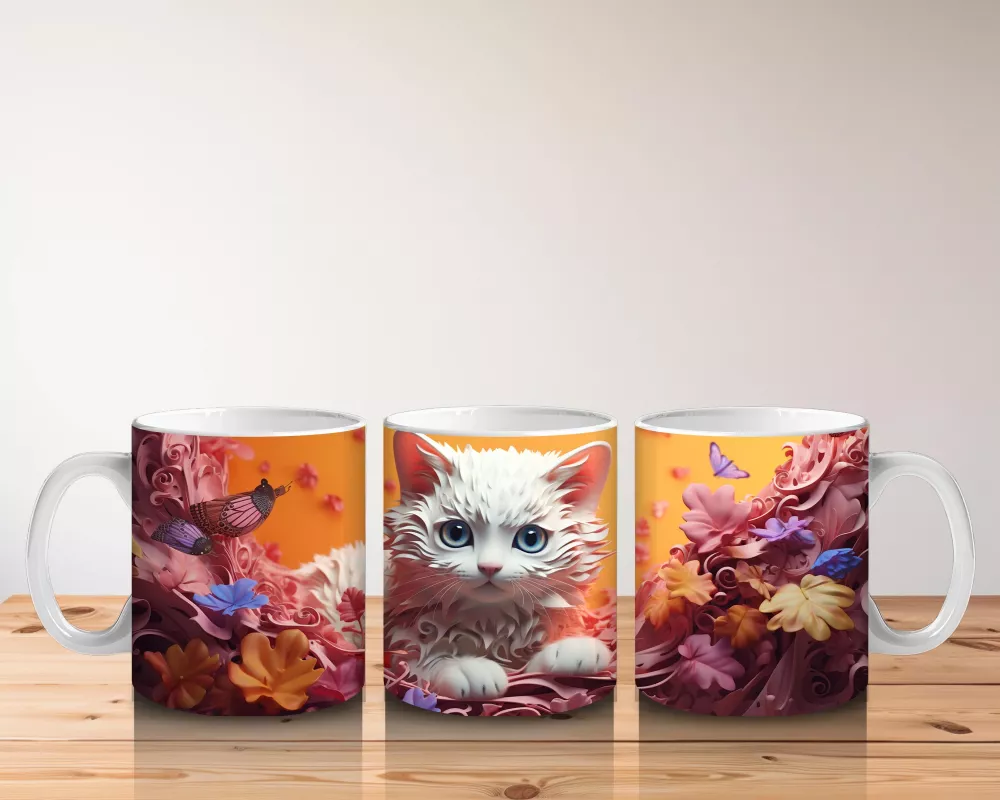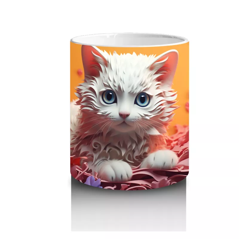 Canlı renklerle bezenmiş arka planda yumuşacık beyaz bir kedi figürü… Minimal ve modern detayları seven kedi tutkunlarına özel zarif bir kupa. 🌈🐾