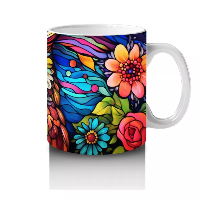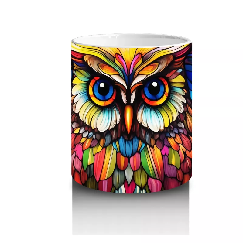Renkli Çiçekler Arasında Parlayan Baykuş – Baskılı Kahve Kupası