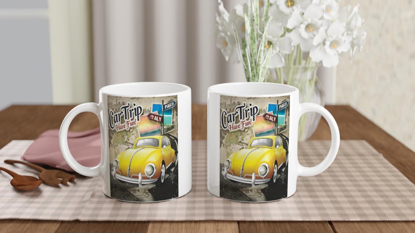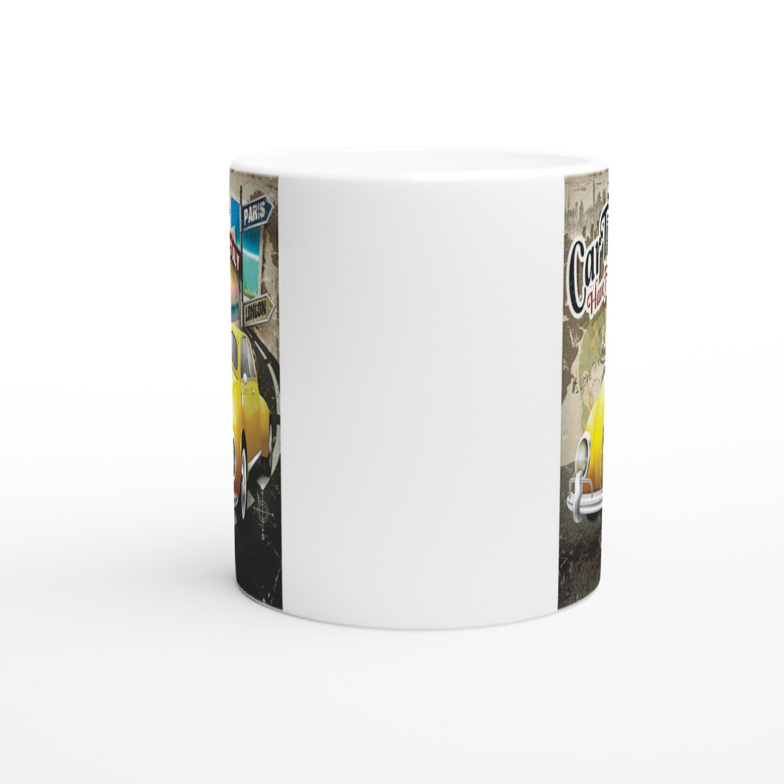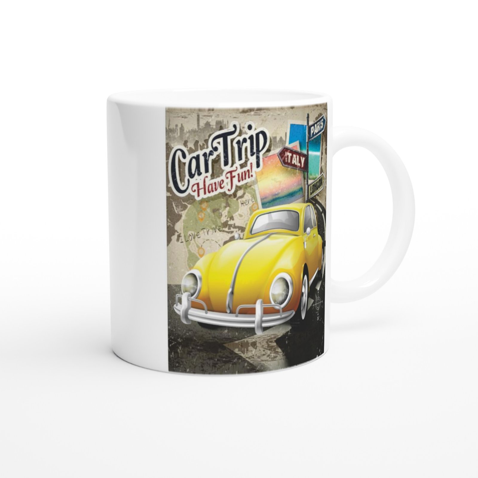 Parlak sarı klasik vosvos ve yön tabelalarıyla bezeli bu kupa, seyahat hayalleri kuranlara ilham veriyor.