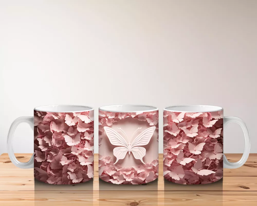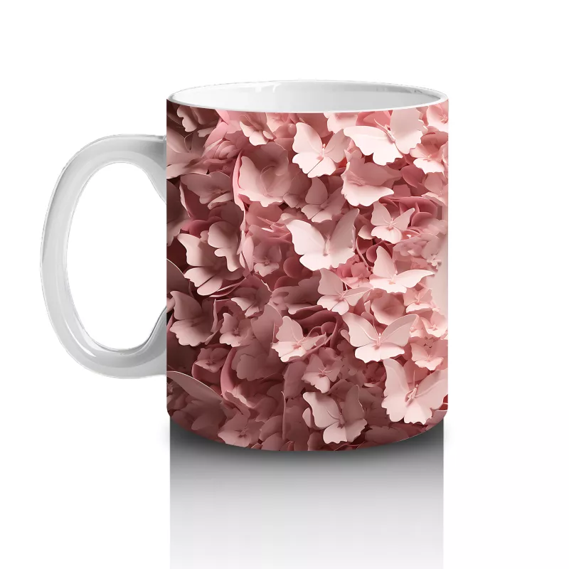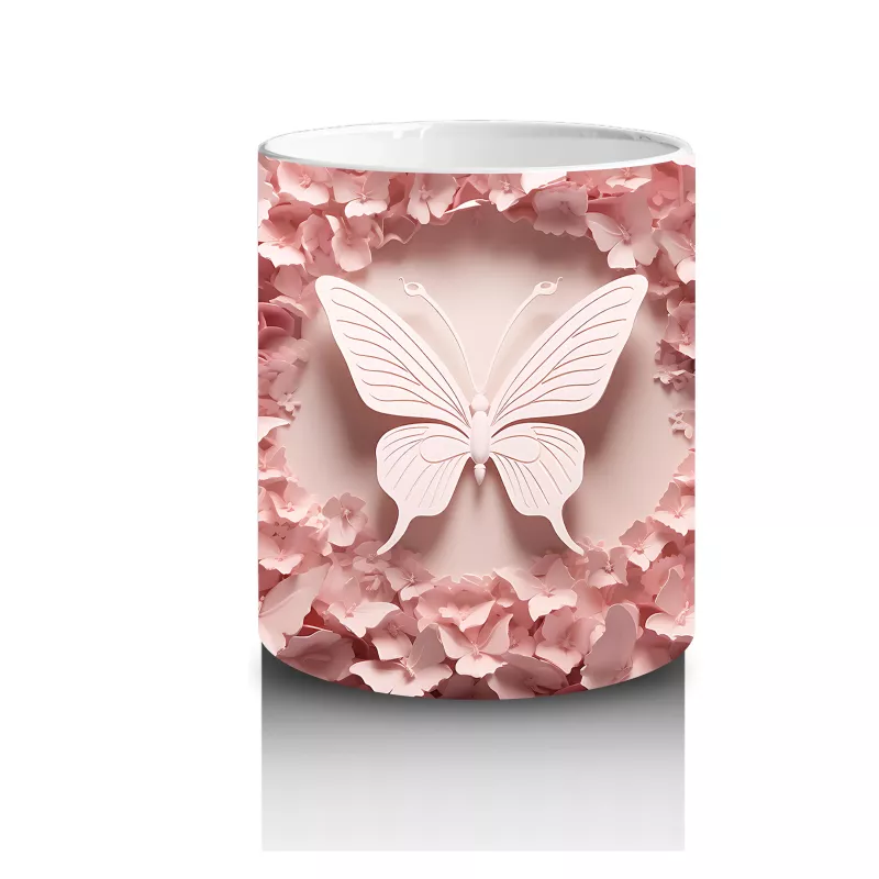 Pembe Rölyef Çiçekler Arasında Kelebek – Baskılı Kahve Kupası