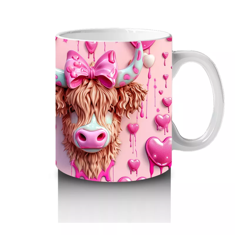 Boynundaki pembe kurdelesiyle zarif bir duruş sergileyen bu romantik inek deseni, aşkın en tatlı halini yansıtıyor. Sevimli ve duygusal tasarımları sevenler için özel bir kupa.