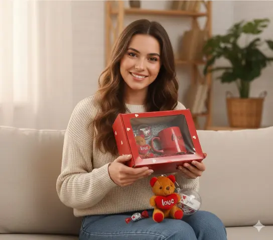 - 🎁 Pencereli Tasarım Kutu: Kırmızı renkli, kalp desenli ve içindeki ürünleri koruyan şık sunum kutusu.