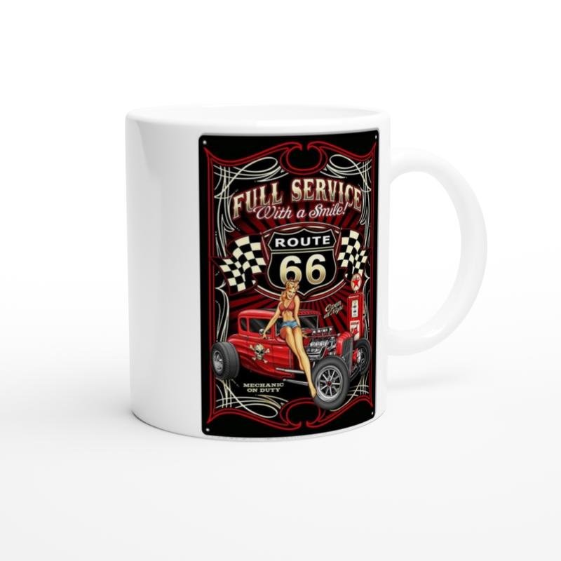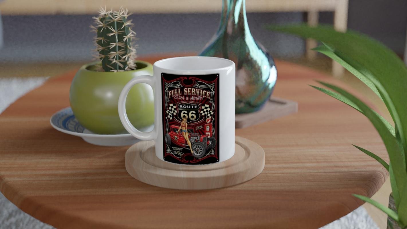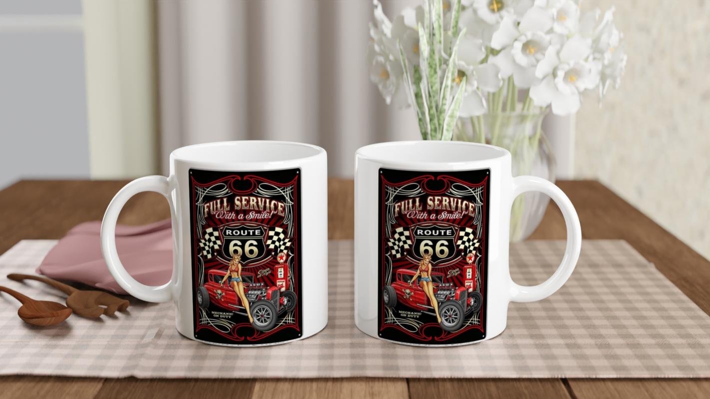 Route 66 ruhunu yaşatan bu retro servis temalı baskılı kupa, vintage araba severlerin koleksiyonuna özel.