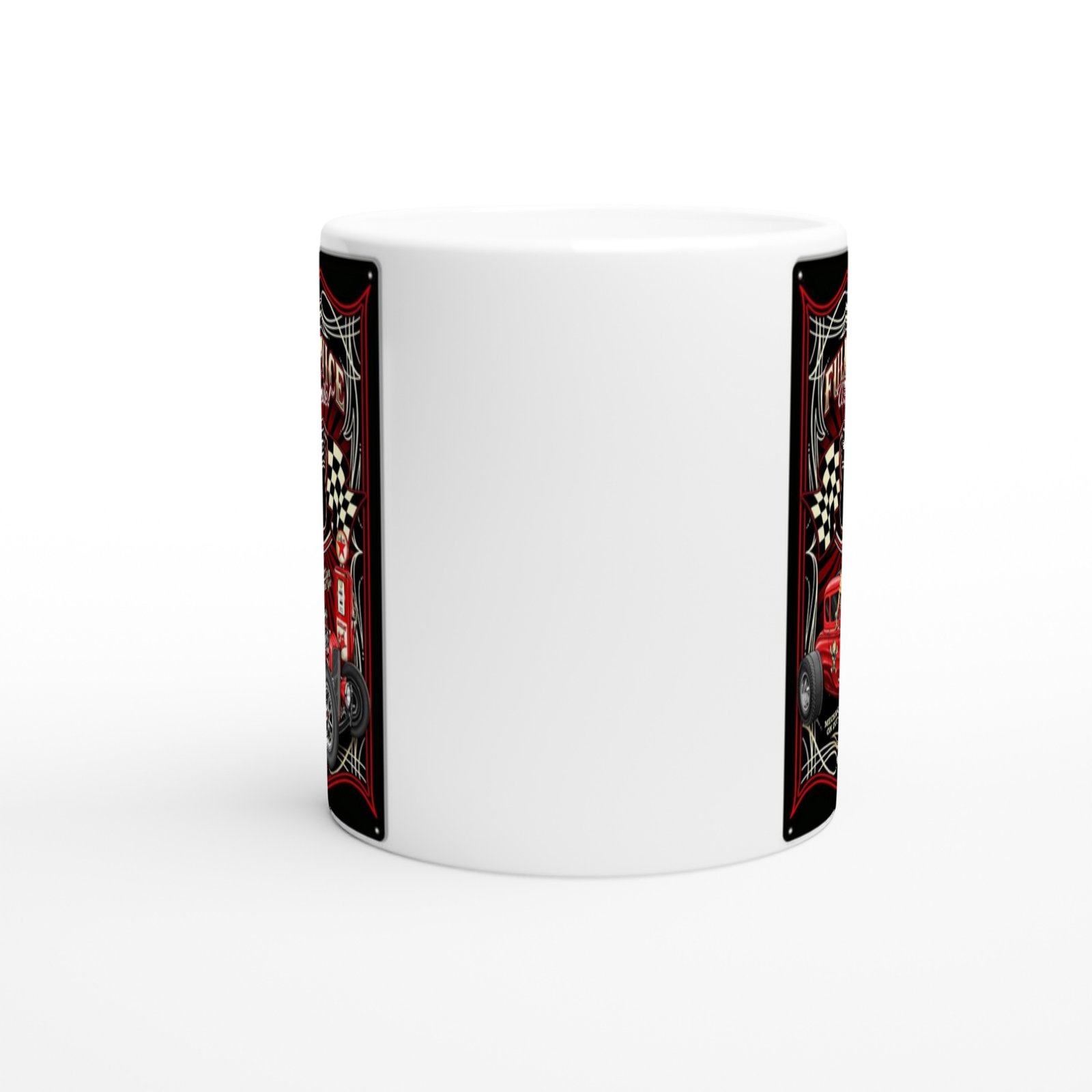 Kırmızı klasik araç, benzin pompası ve pin-up tarzıyla dikkat çeken bu Route 66 baskılı kupa bardak, nostaljiye yolculuk başlatır.