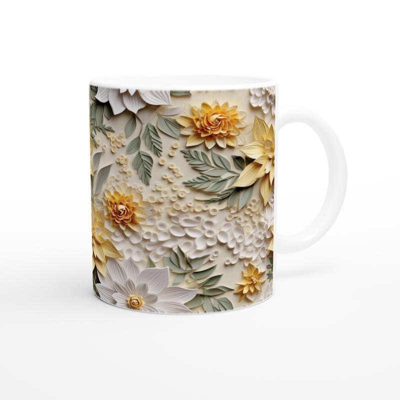 Sarı, beyaz ve yeşil tonlarının huzur verici uyumuyla tasarlanmış bu sarı beyaz yeşil çiçekli kupa bardak, doğadan ilham alan zarif bir şıklık sunar.