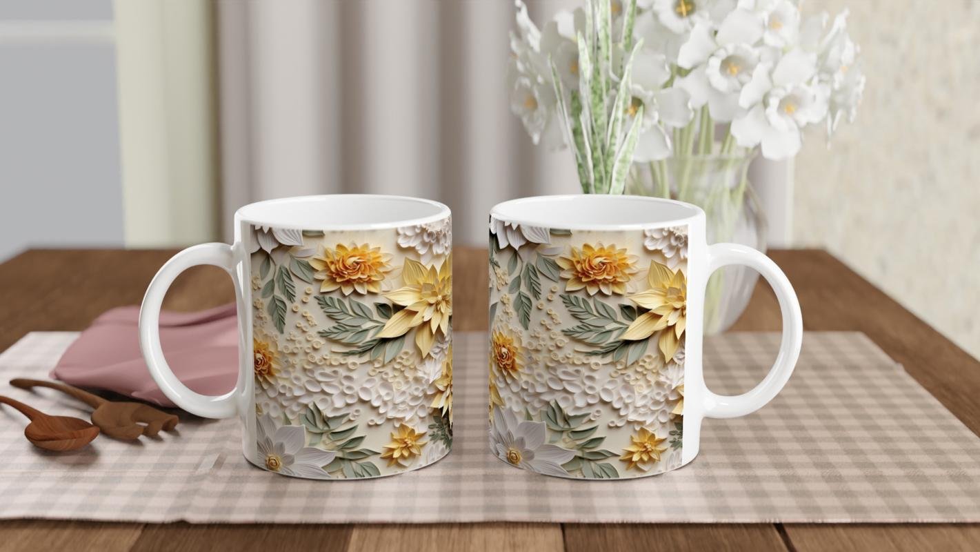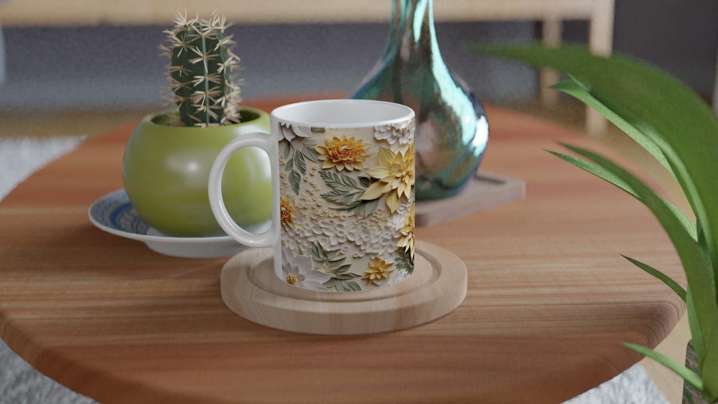 Doğal Işıkta Sarı Çiçekler Kupa Bardak, ince yaprak detayları ve üç boyutlu çiçek dokusuyla hem zarif hem sıcak bir atmosfer yaratır. Günlük kullanımda içeceklere doğa esintisi katmak isteyenler için harika bir seçim.