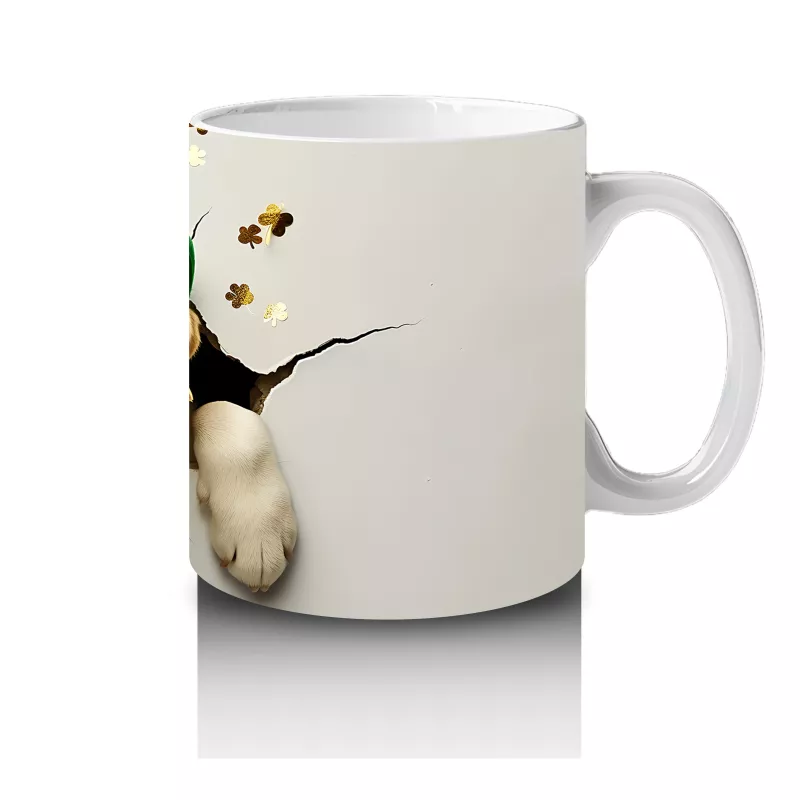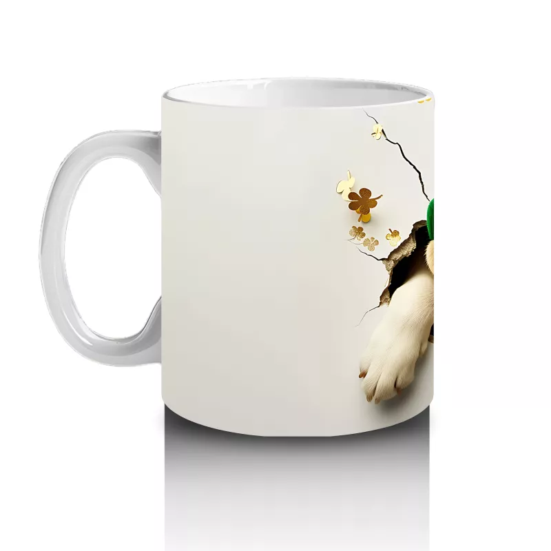 Parlak sarı tüyleriyle dikkat çeken şapkalı köpek, yeşil fonla kontrast oluşturuyor. Canlı ve enerjik detayları sevenler için sıcak ve dinamik bir kupa tasarımı.