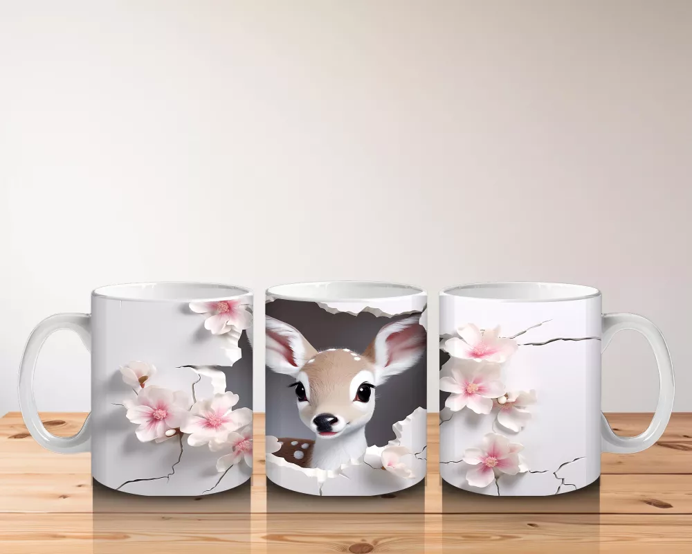 Pembe Çiçekler Arasında Bakan Sevimli Geyik – Baskılı Kahve Kupası
