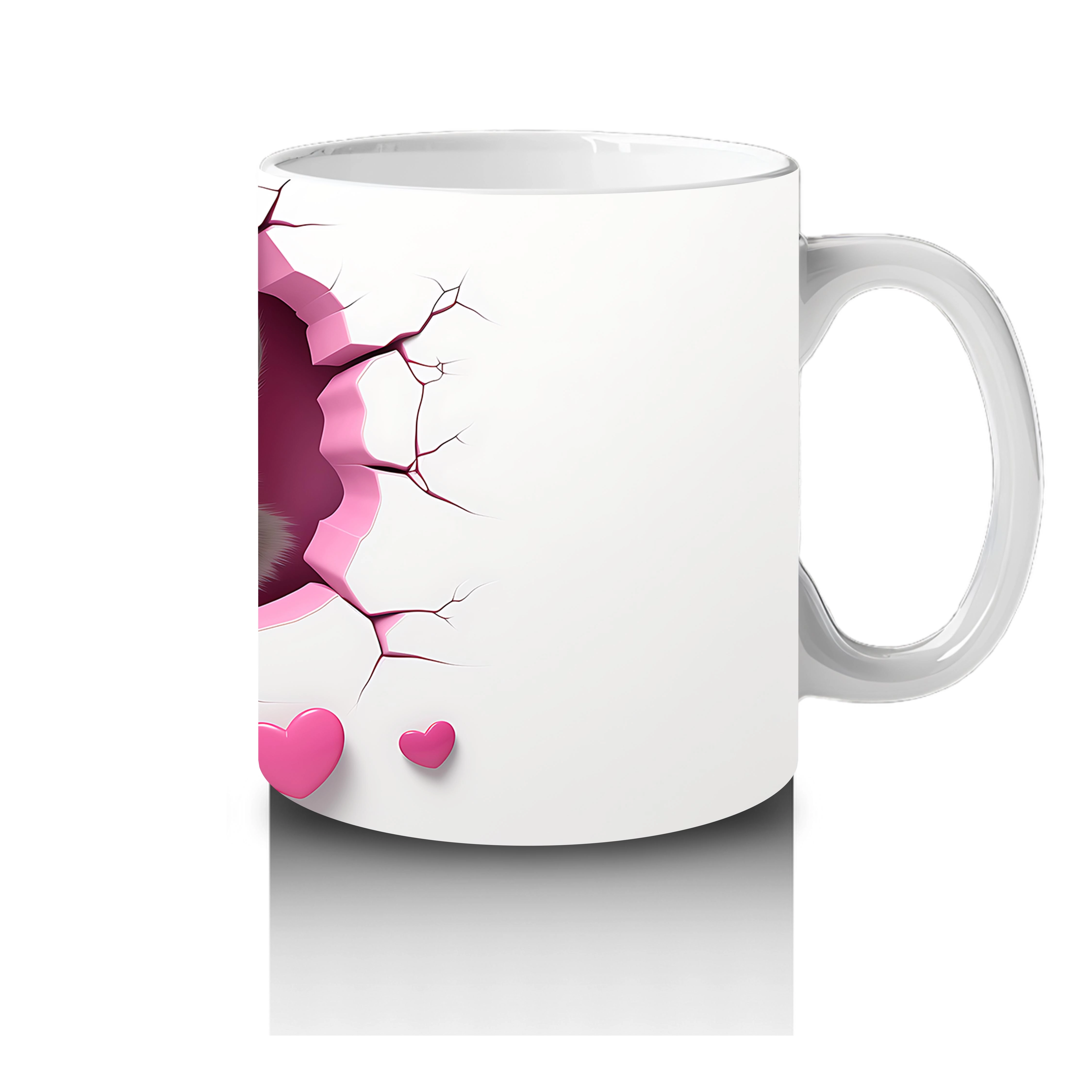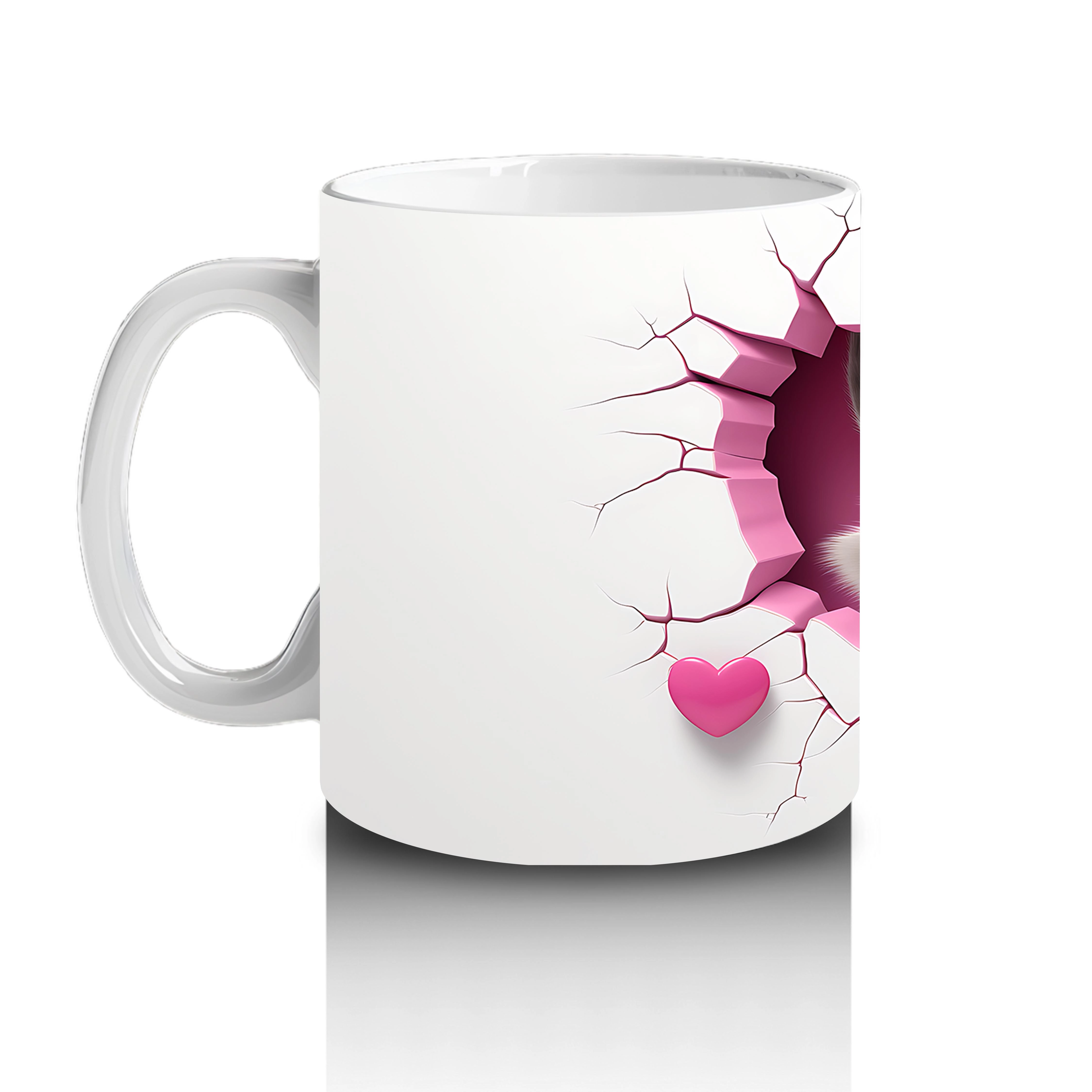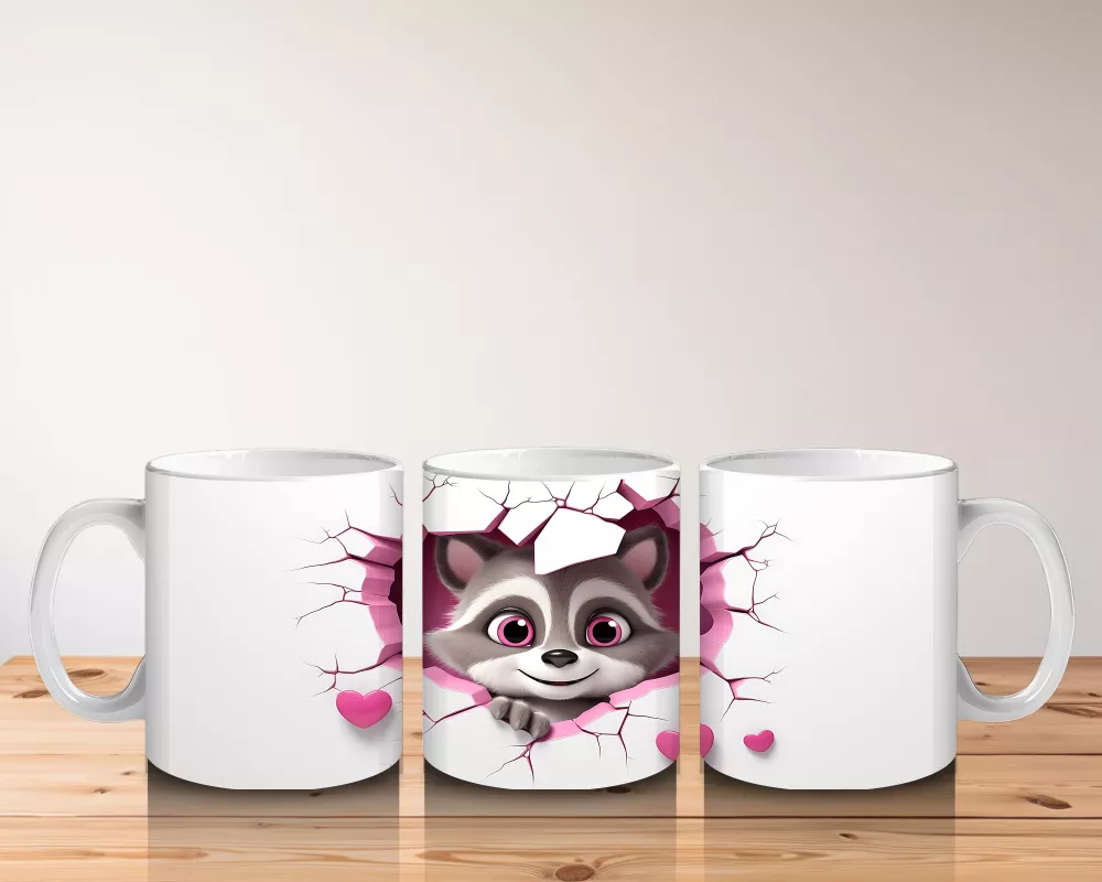 Kalpli çatlak duvarın önünde duran rakun, şaşkın ve tatlı bakışlarıyla gönülleri fethediyor. Hem eğlenceli hem de sevgi dolu bir atmosfer yaratan sevimli bir kupa.