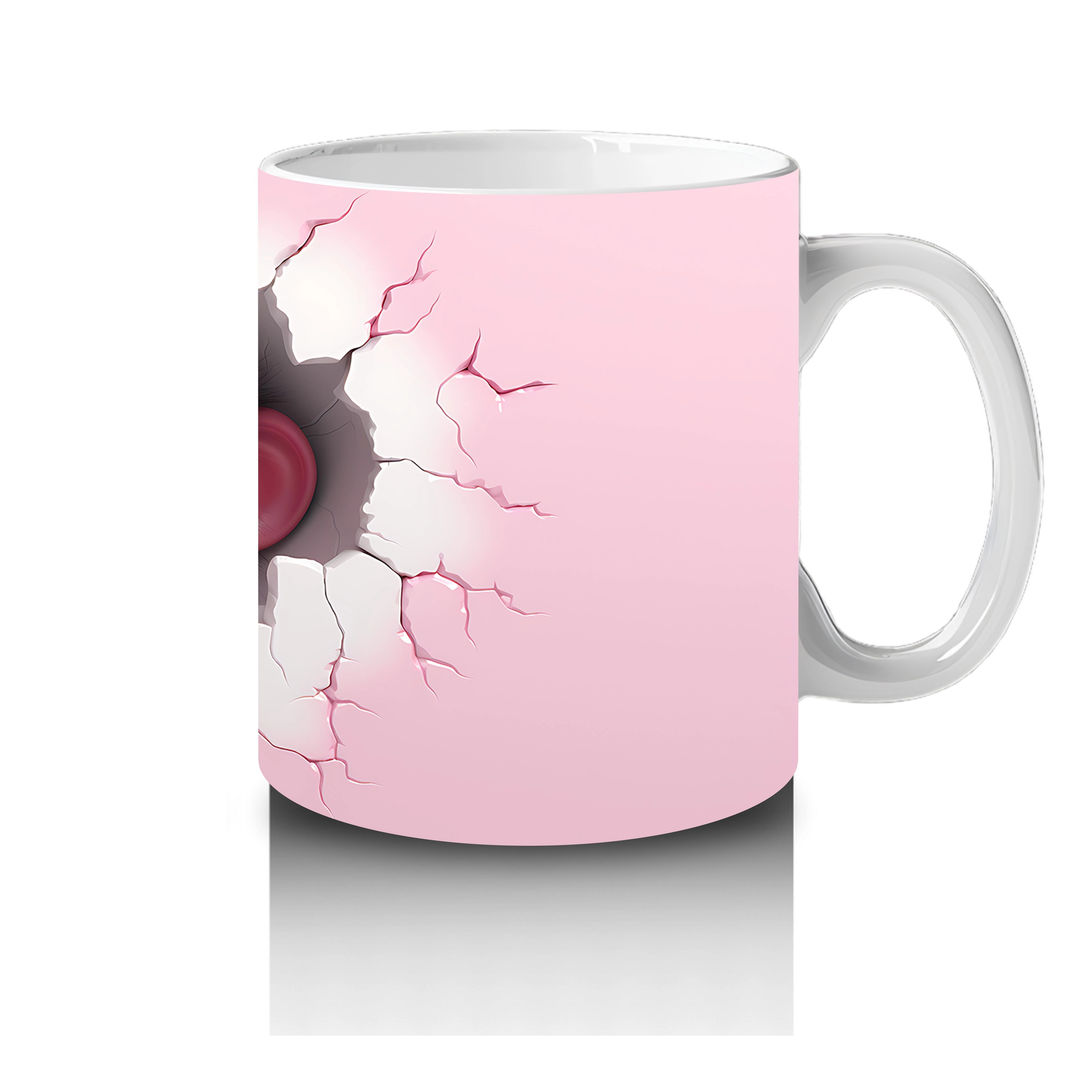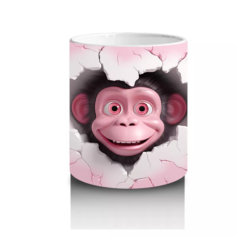 Kalp şeklindeki çatlak zeminden gülümseyerek bakan bu şempanze figürü, eğlenceli ve enerjik bir hava katıyor. Mizahi dokunuşlarla sevgi temasını harmanlayan sevimli bir kupa tasarımı.