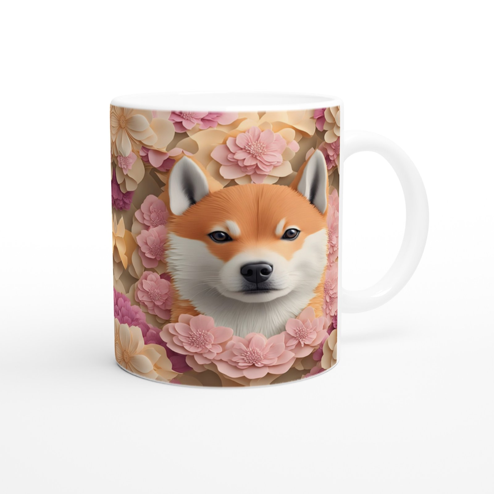 Pastel Çiçekler Arasında Shiba Inu Köpek Baskılı Kupa Bardak, estetik detayları ve sıcak renk geçişleriyle dekoratif ve hediye olarak tercih edilebilecek özel bir üründür.