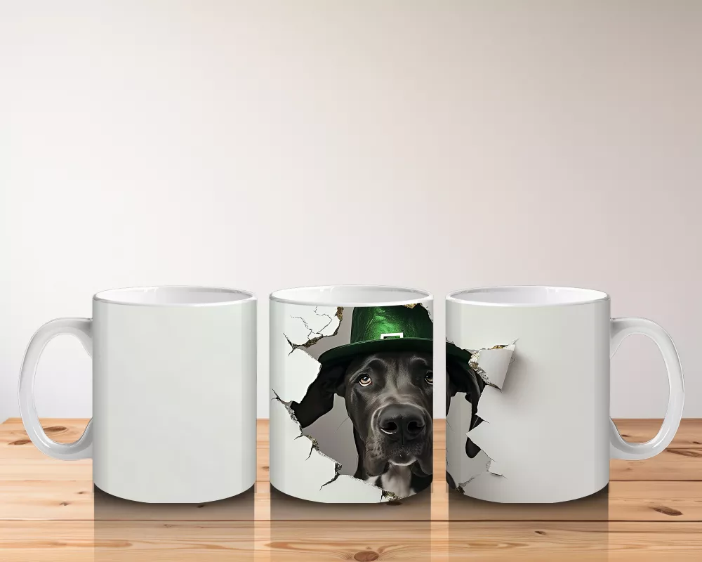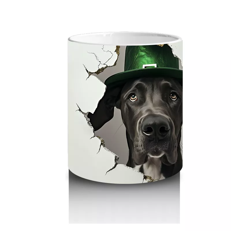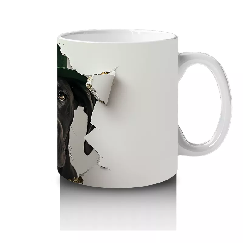 Şapkalı Siyah Köpek ve Yonca Deseni – Baskılı Kahve Kupası