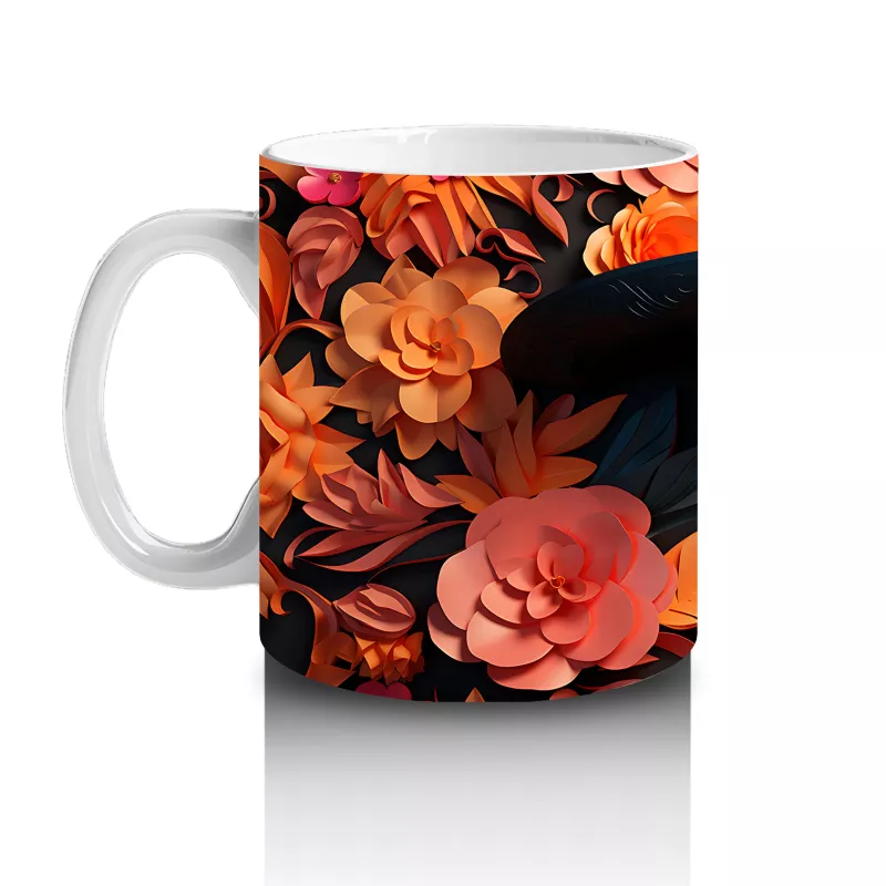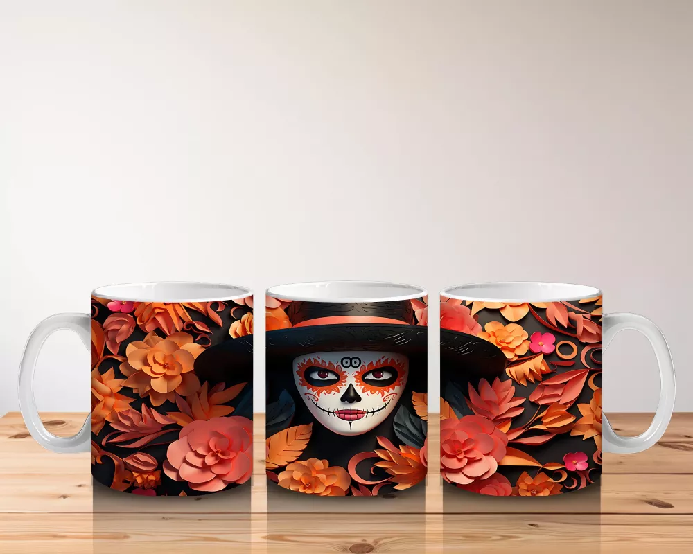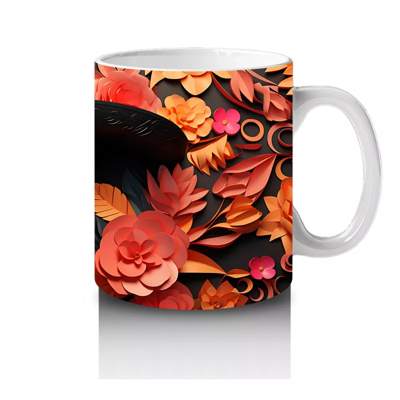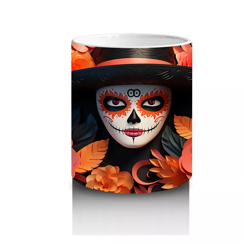 Kırmızı güllerle çevrili, giiyah şapkalı figürüyle dikkat çeken bu Cadılar Bayramı baskılı kupa, gotik şıklığı sevenler için ideal bir hediyelik kahve kupası seçeneğidir.