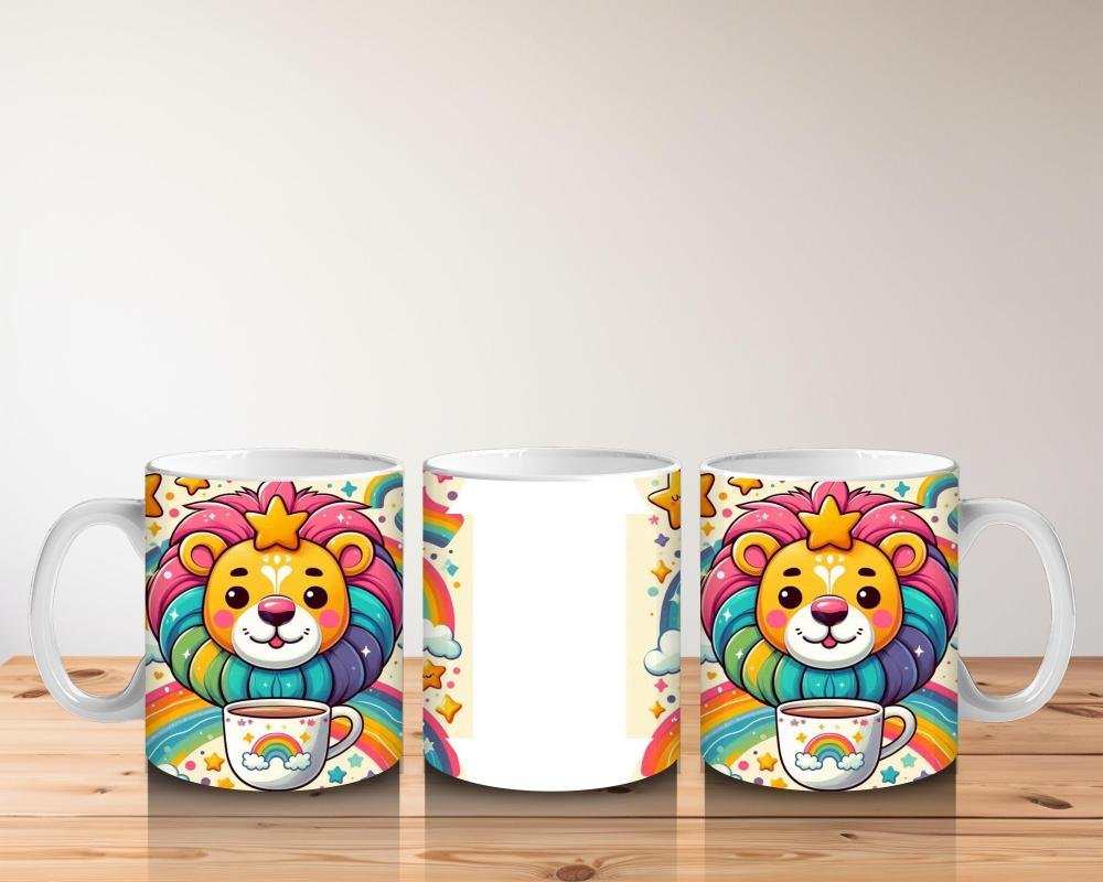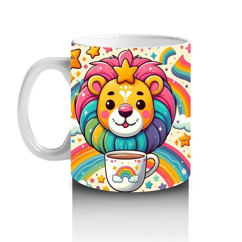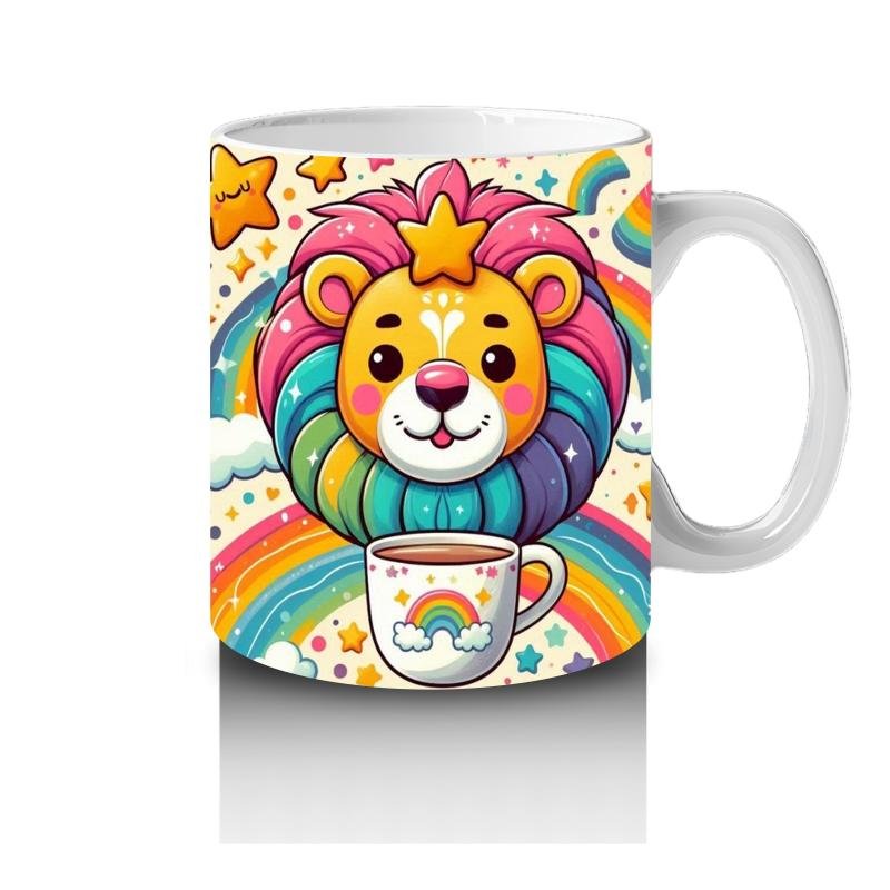 Gökkuşağı yelesiyle parlayan bu sevimli aslan, elindeki süt kupasıyla miniklere güçlü ve keyifli bir süt molası sunuyor.