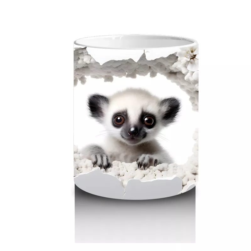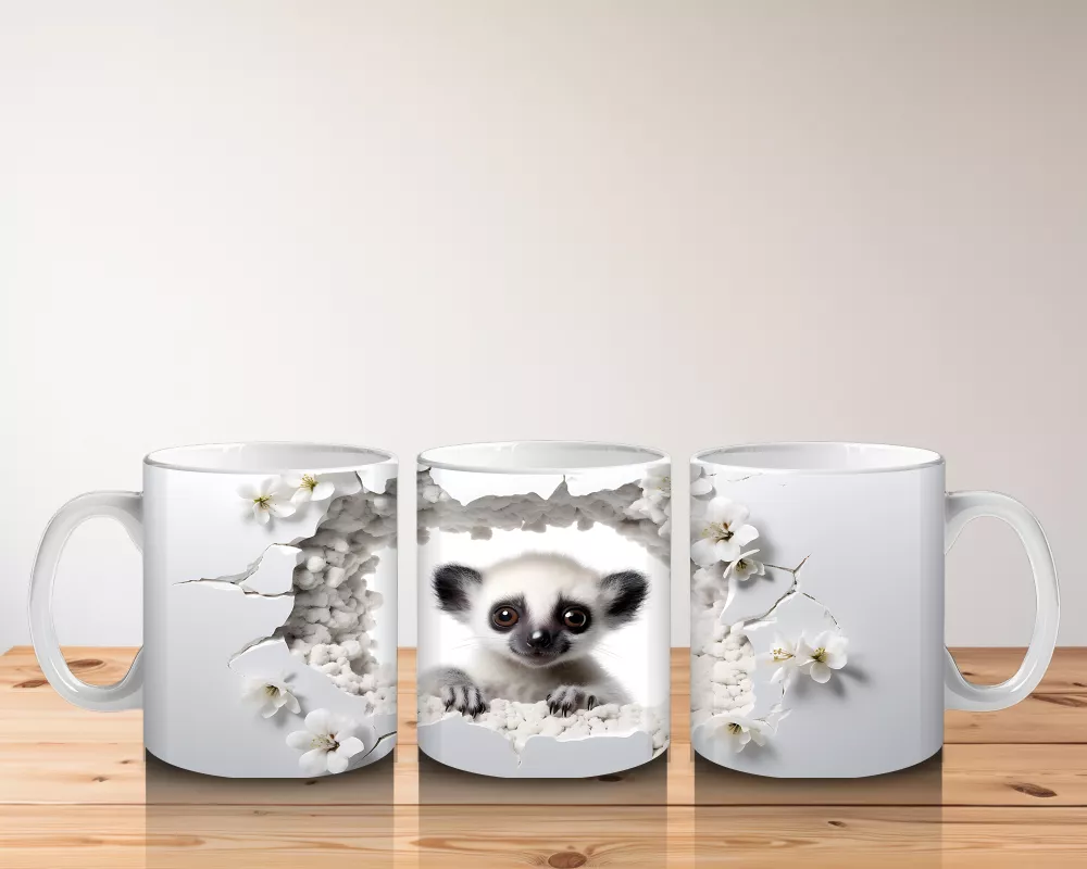 Kırık duvarın arasından bakan bu tatlı lemur, sevimli bakışlarıyla anında dikkat çekiyor. Egzotik ve farklı tasarımlar sevenlere özel eğlenceli bir kupa.