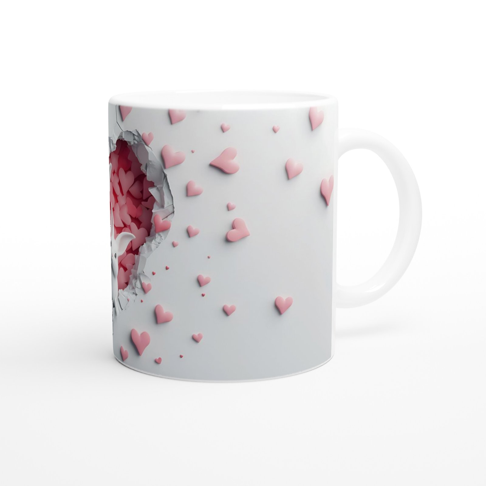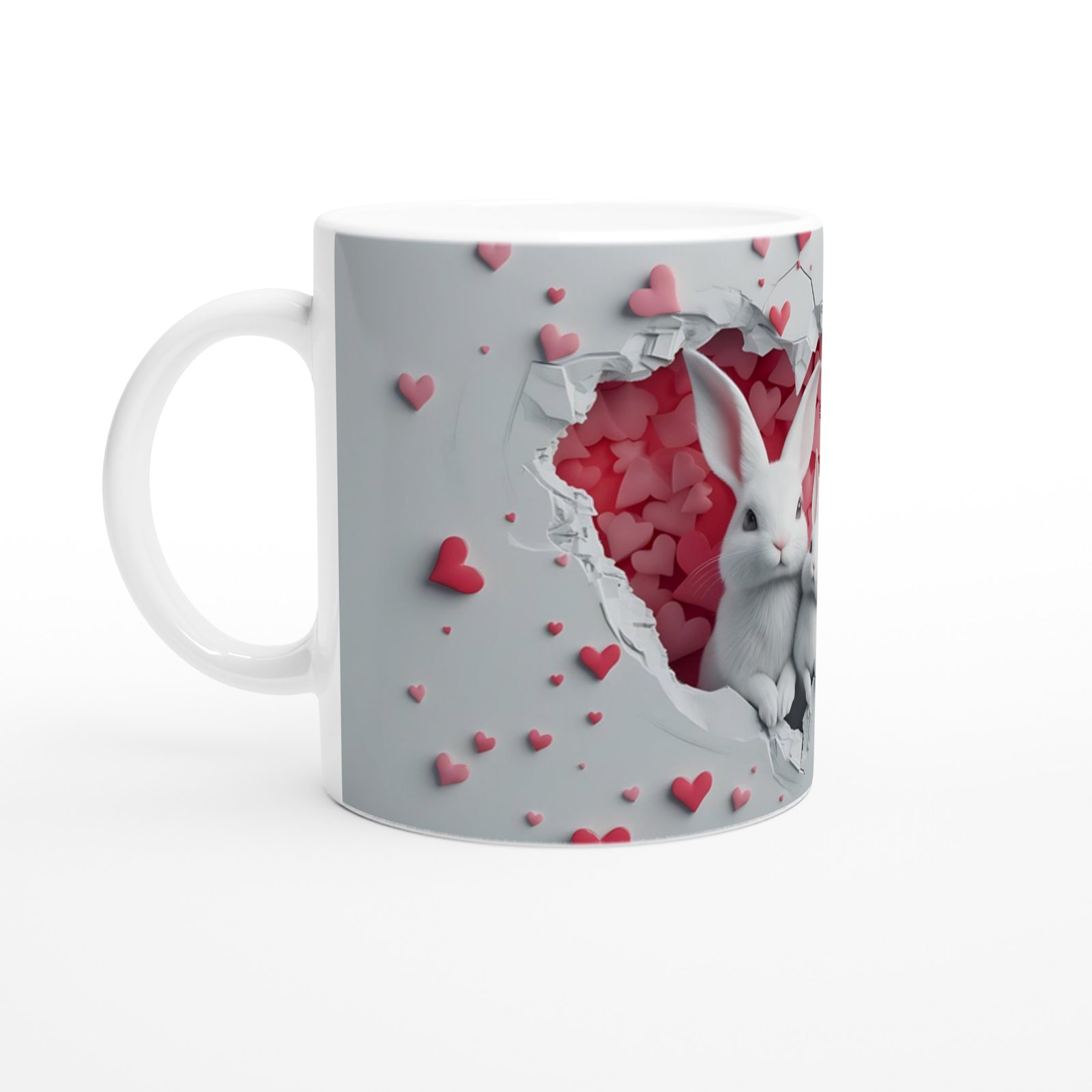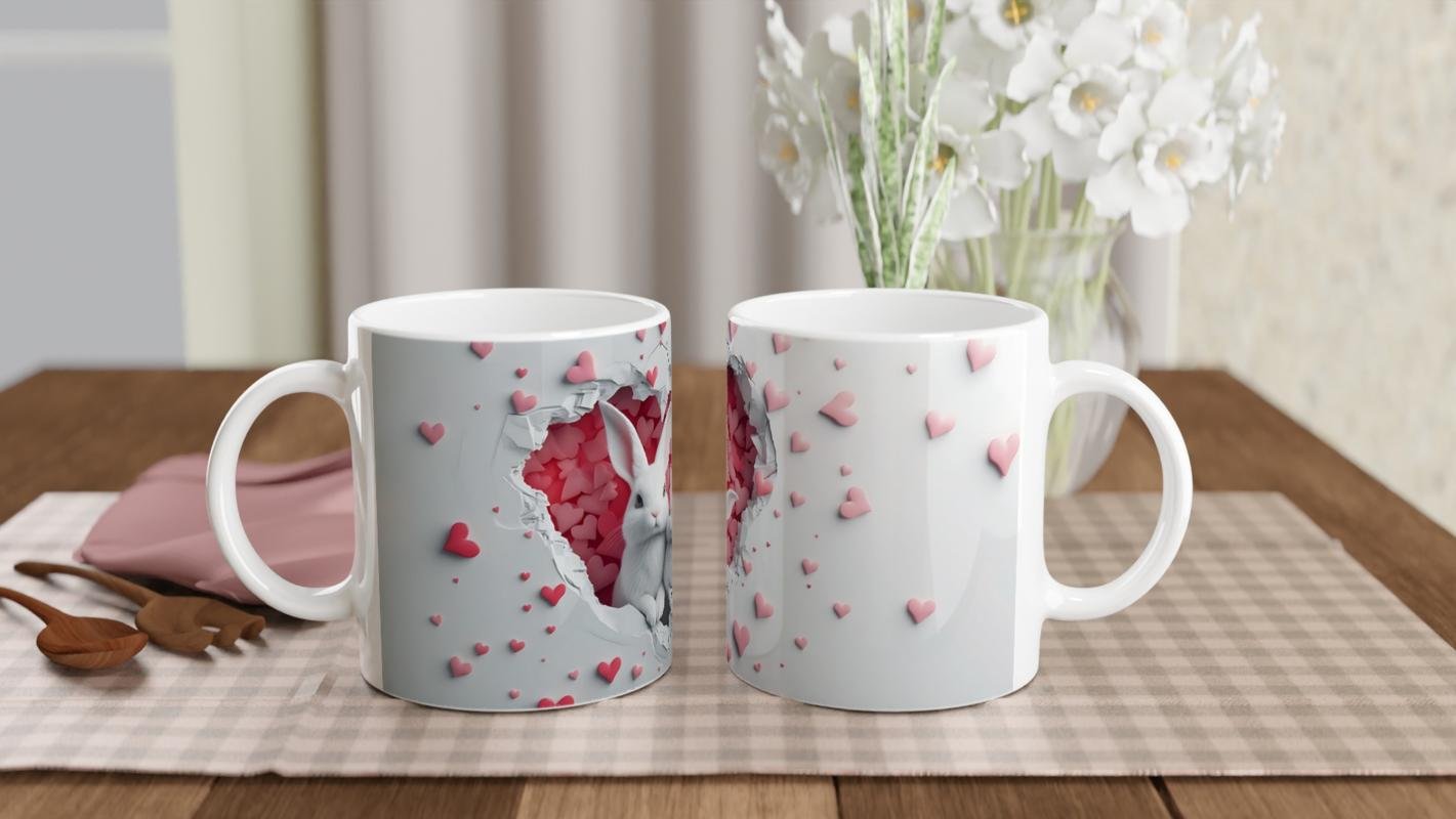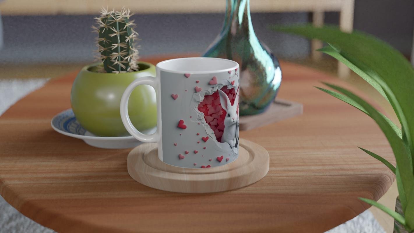 Kalp şeklinde çatlamış duvarın içinden sevimli iki beyaz tavşanın birlikte çıkışı, bu kupayı hem romantik hem de eğlenceli bir hediye seçeneği haline getiriyor. Özellikle çiftler için ya da aile temalı hediyelerde tercih edilebilecek zarif bir tasarım.