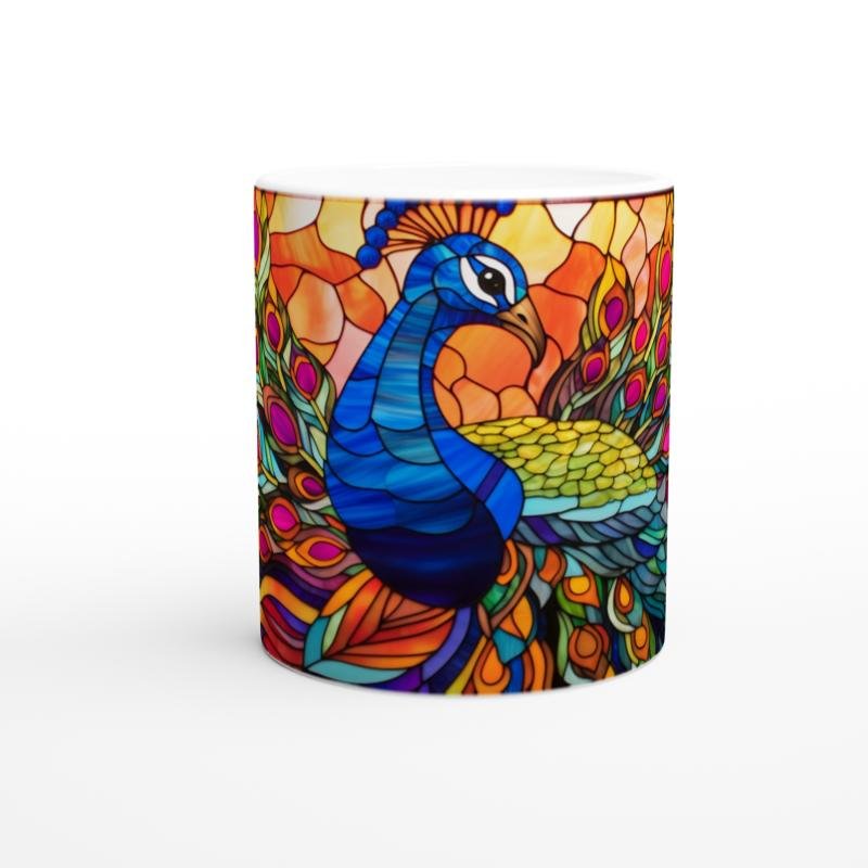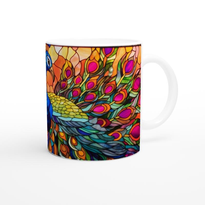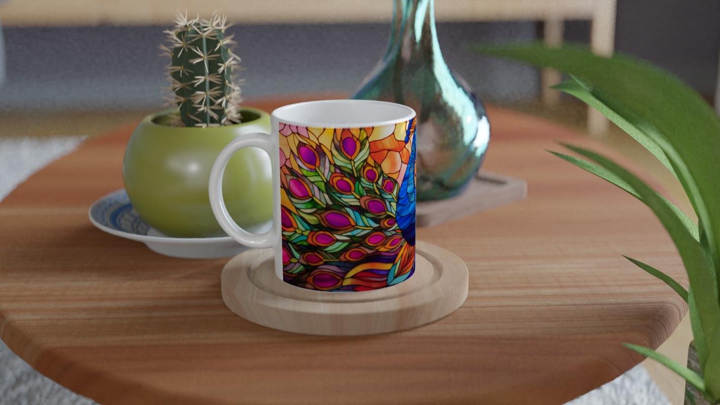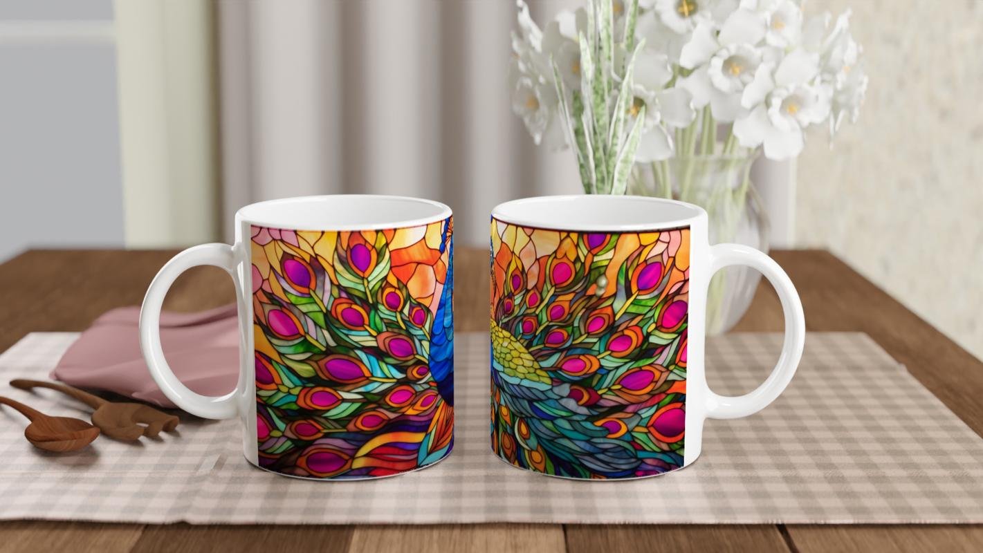 Gökkuşağı Kanatlı Tavus Kuşu Vitray Desenli Baskılı Kupa Bardak, her yudumda renklerin büyüsünü yaşatıyor. Parlak tonlarda tasarlanmış detaylı tüy figürleriyle estetik ve şık bir içim deneyimi sunar.