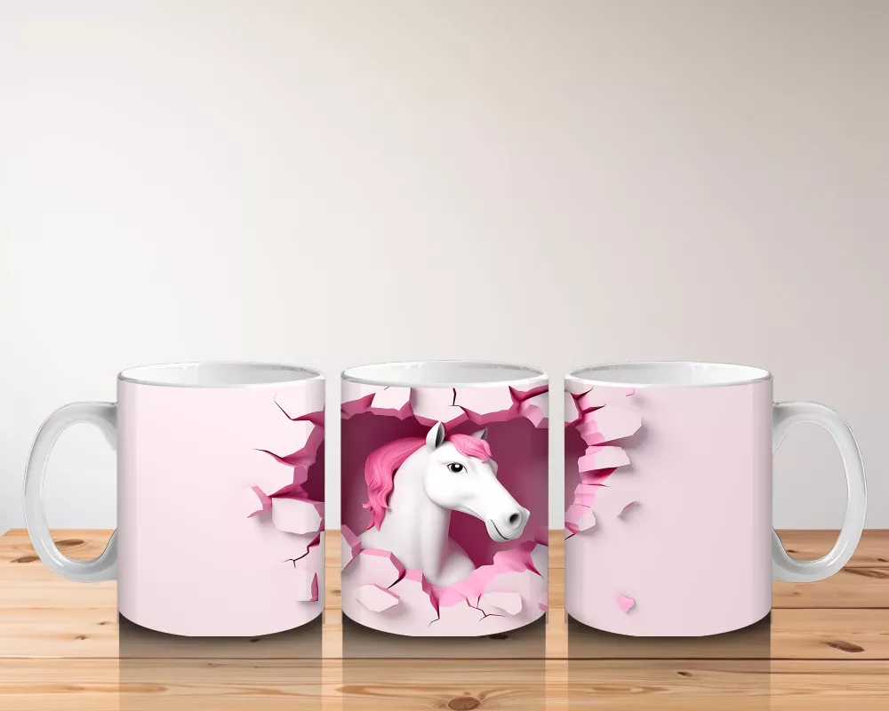 Pembe Kalpli Duvar Önünde Tek Boynuzlu At – Baskılı Kahve Kupası