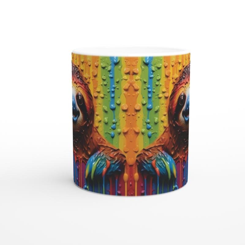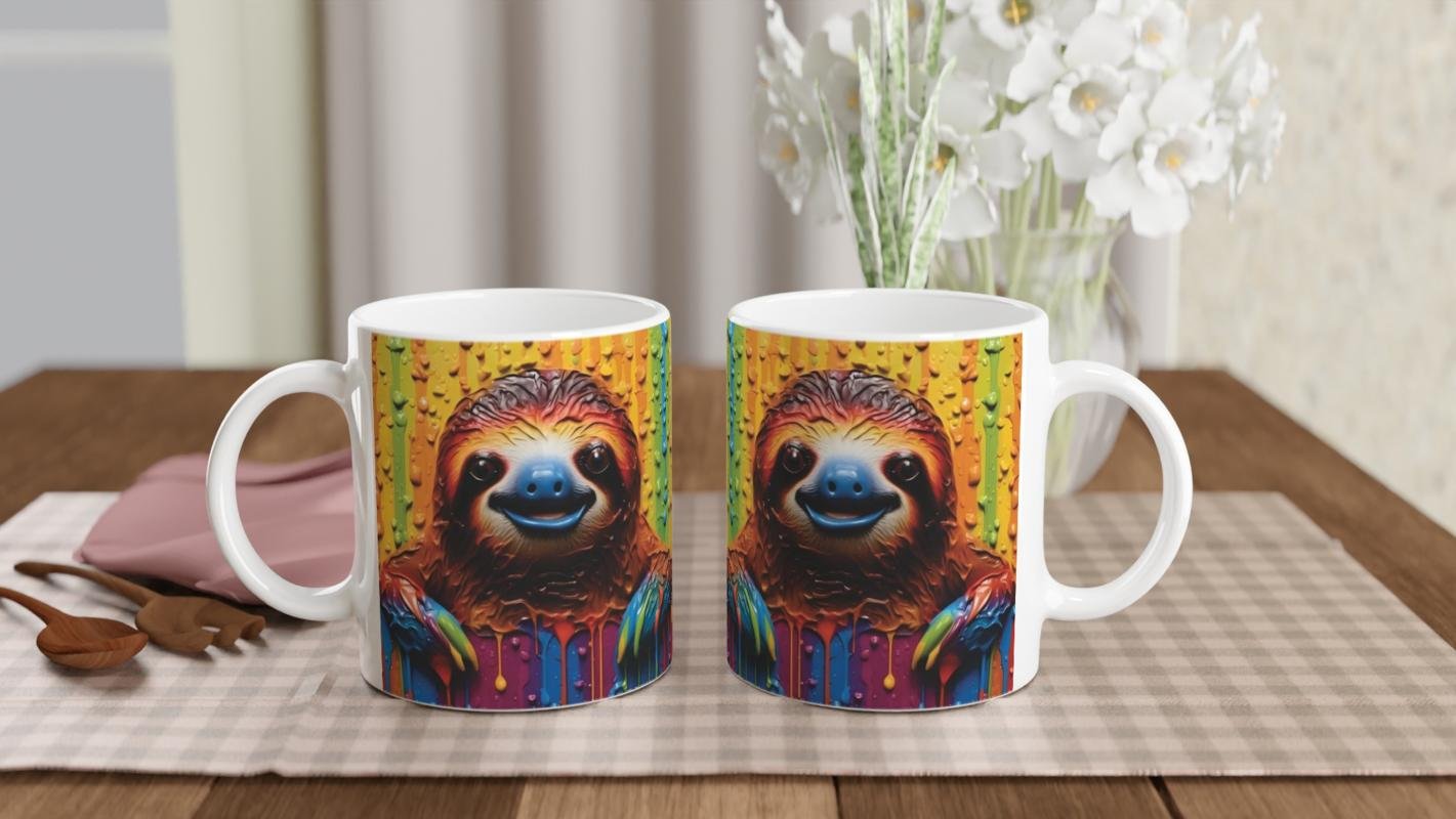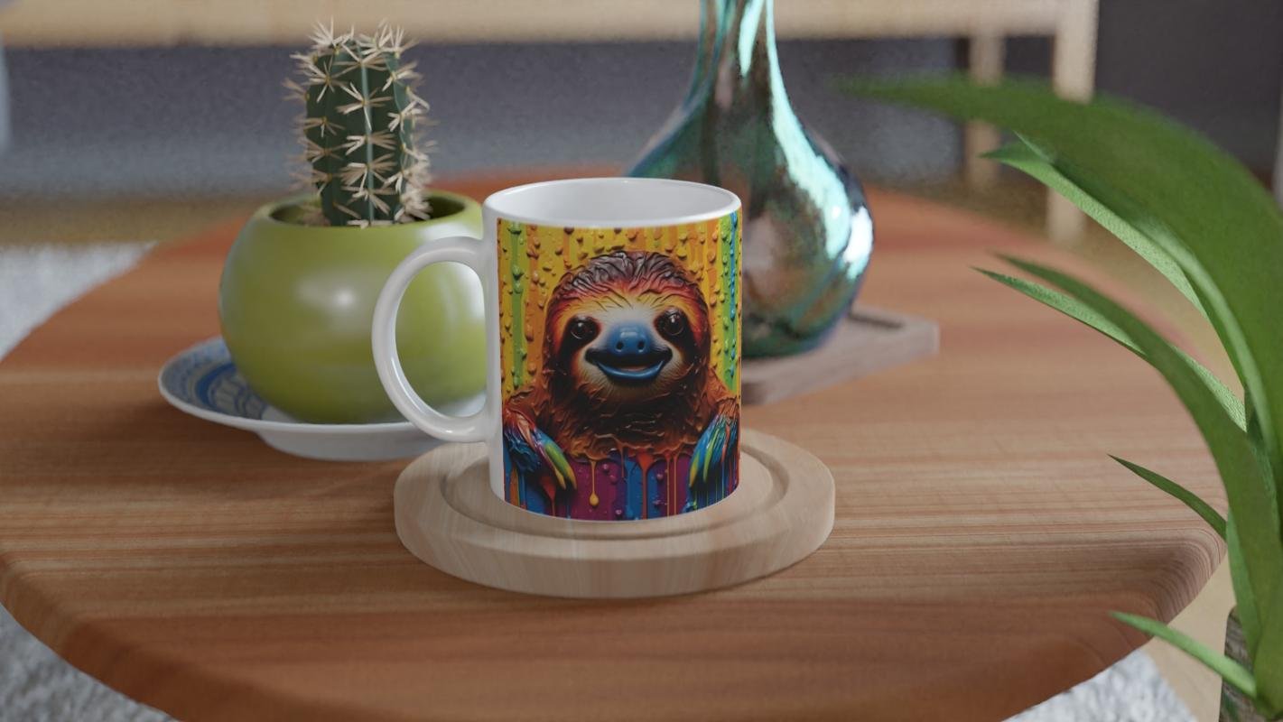 Renkli boya damlalarıyla süslenmiş arka planın önünde kocaman gülümsemesiyle sizi selamlayan bu tembel hayvan, sabah kahvelerini eğlenceye dönüştürüyor.