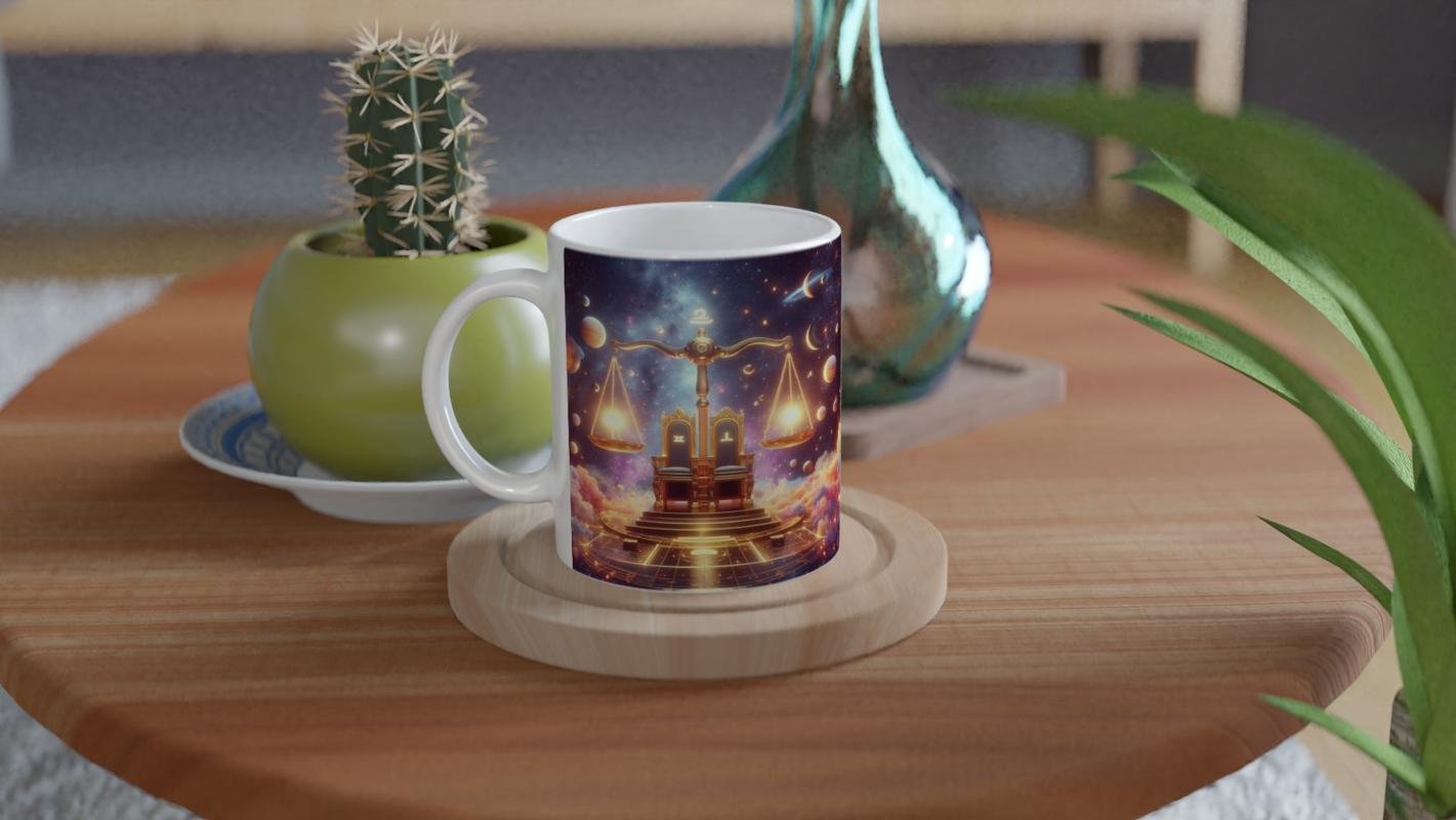 Estetik tutkunu Terazi’ler için kozmik taht baskılı kupa bardak. Dengeli ve özgün tasarımıyla dikkat çeker.