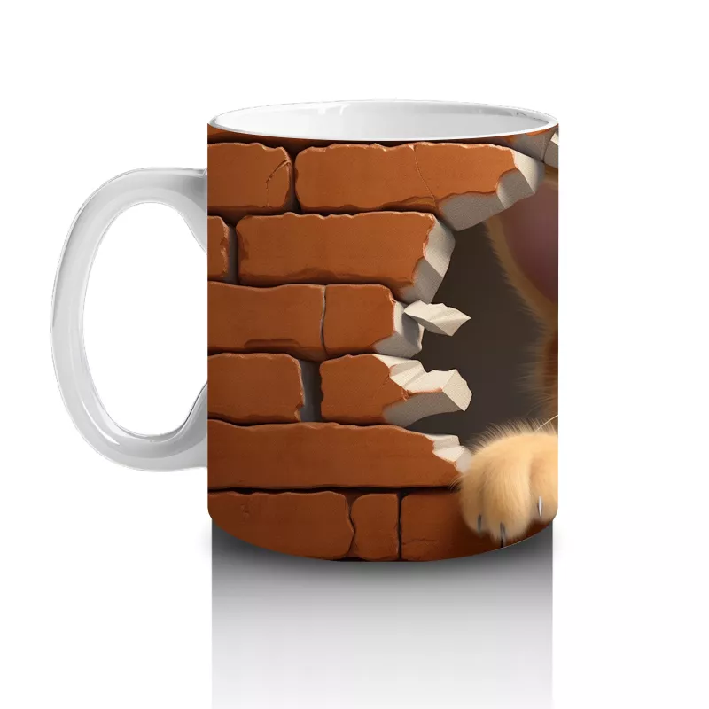 Tuğla Duvar Arasından Bakan Neşeli Kedi – Baskılı Kahve Kupası