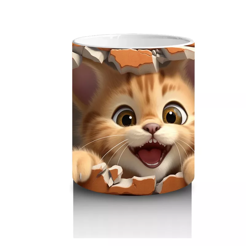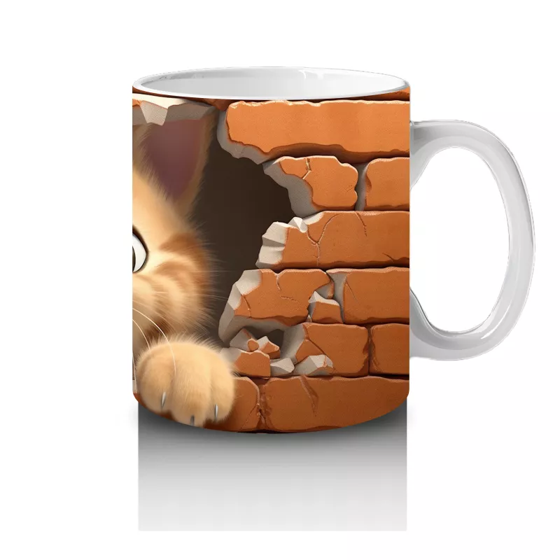 Tuğla duvarın aralığından size neşeyle bakan sevimli bir kedi… Gününüze pozitif enerji katacak bu eğlenceli tasarım, kahve keyfini daha da özel kılıyor. 🧱😺