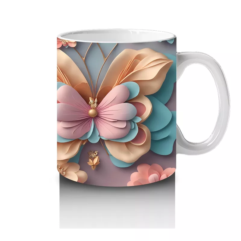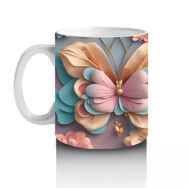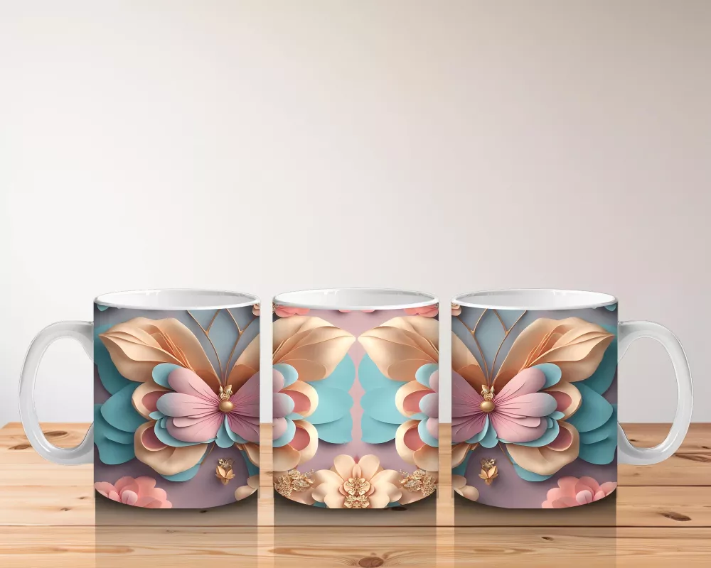 Turkuaz Tonlarda Çiçekli Kelebek İkilisi – Baskılı Kahve Kupası