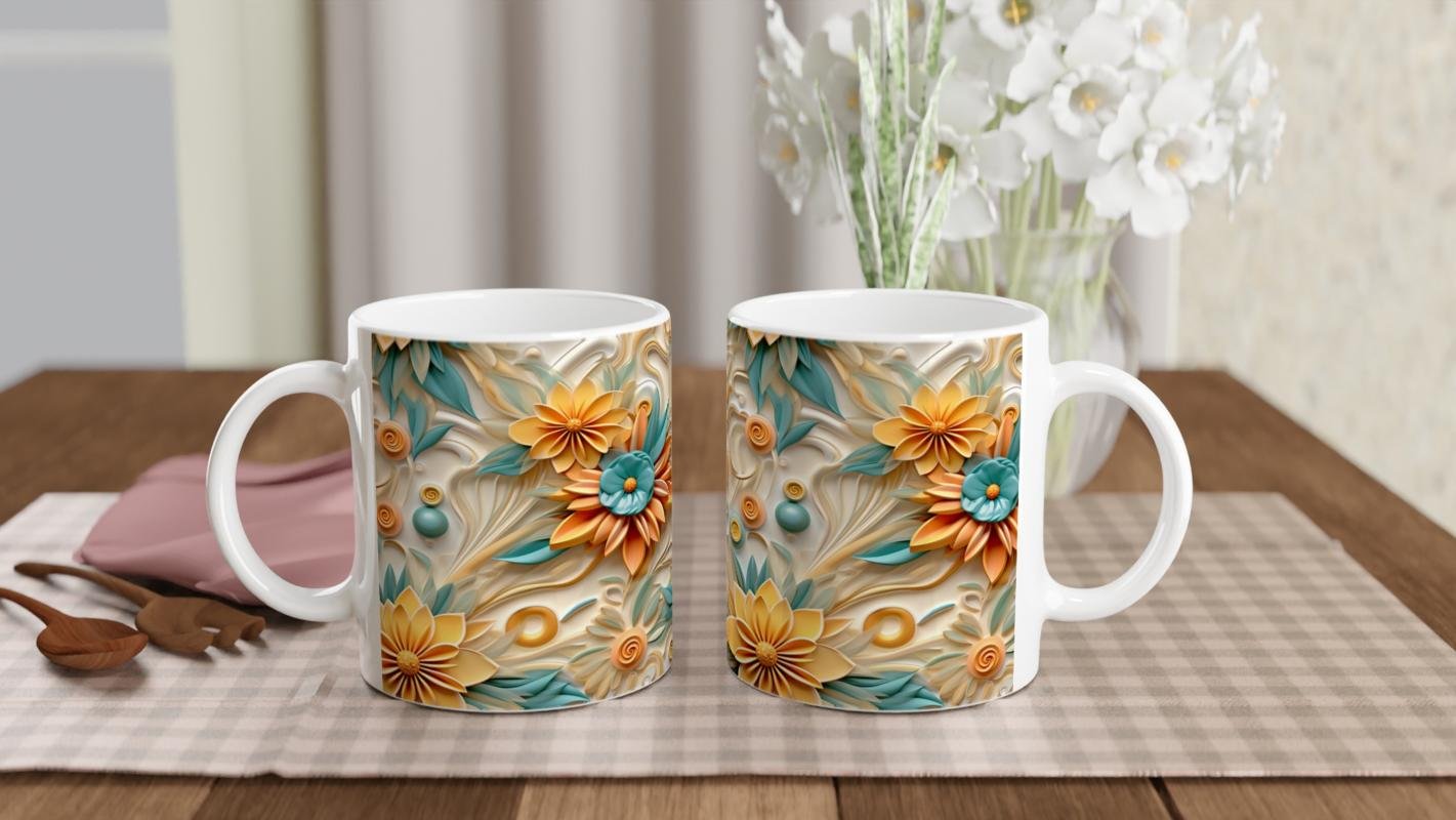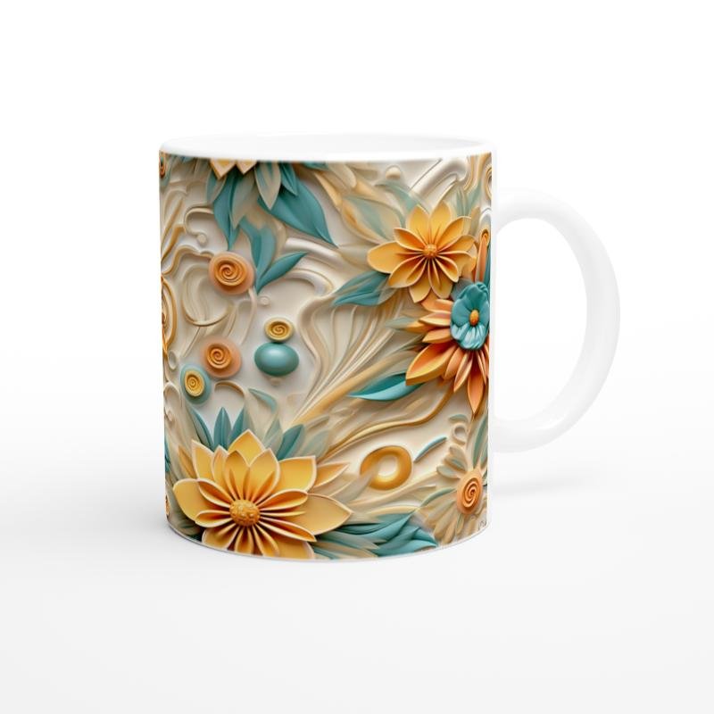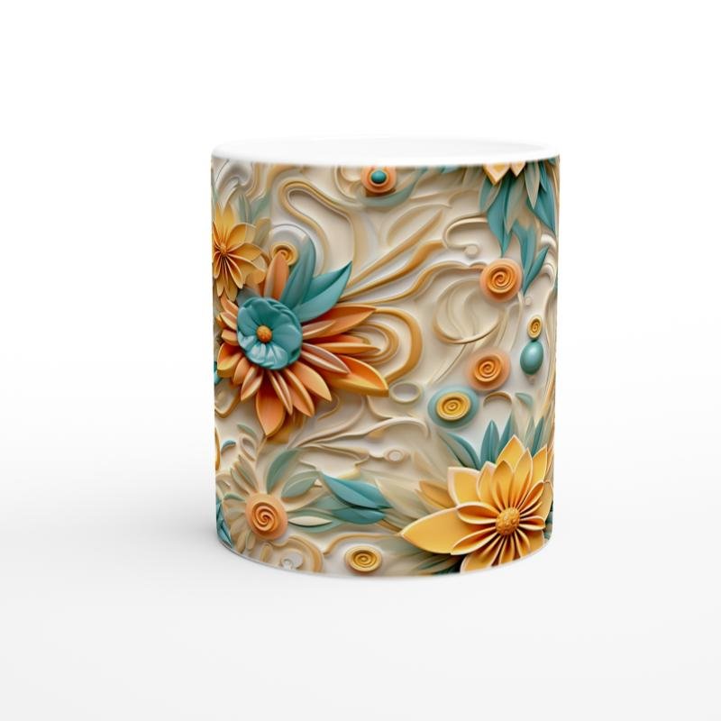 Katmanlı çiçek yapıları ve spiral süslemelerle hareket kazanan bu kupa bardak, içimi keyifli hale getirir.