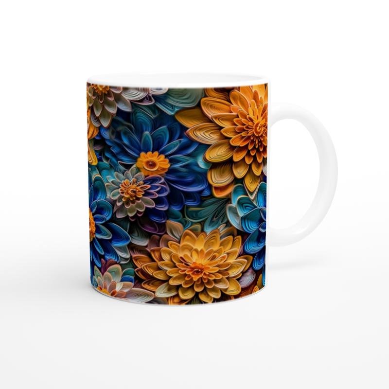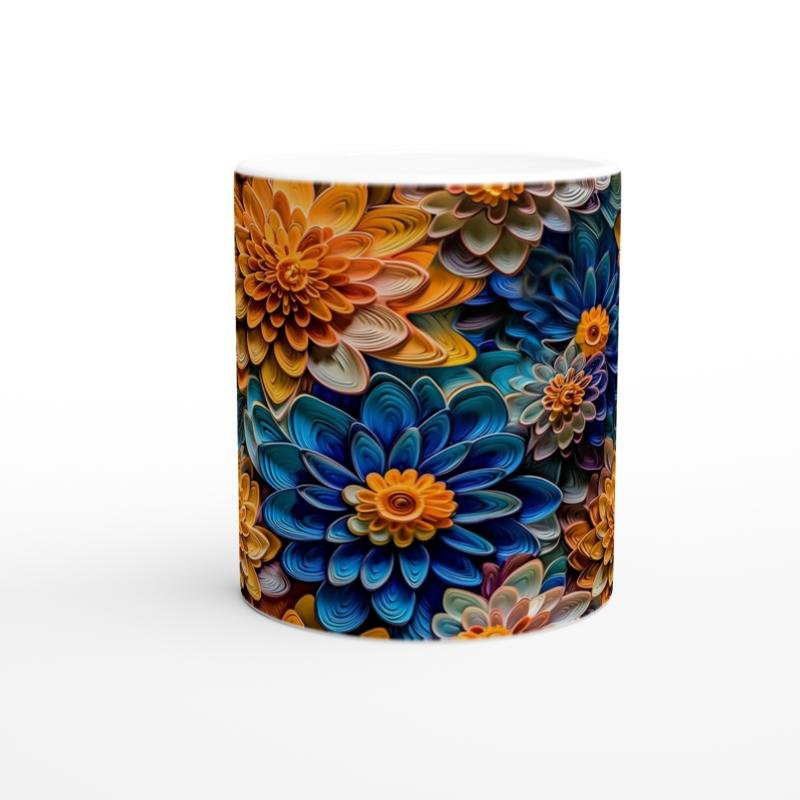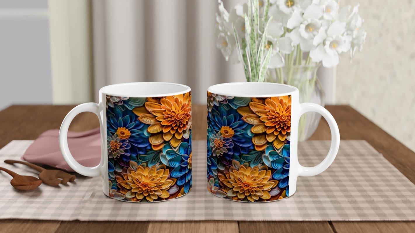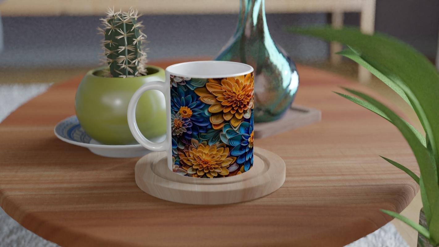 Turuncu ve Gece Mavisi Çiçekler Kupa Bardak, yoğun renk geçişleri ve katmanlı çiçek dokularıyla dikkat çeker. Cesur tasarımıyla fark yaratmak isteyenler için özel bir seçenek sunar.