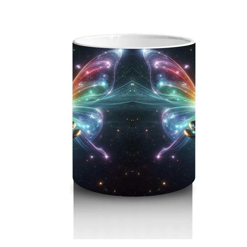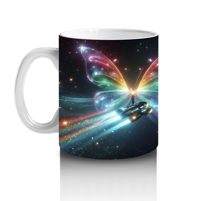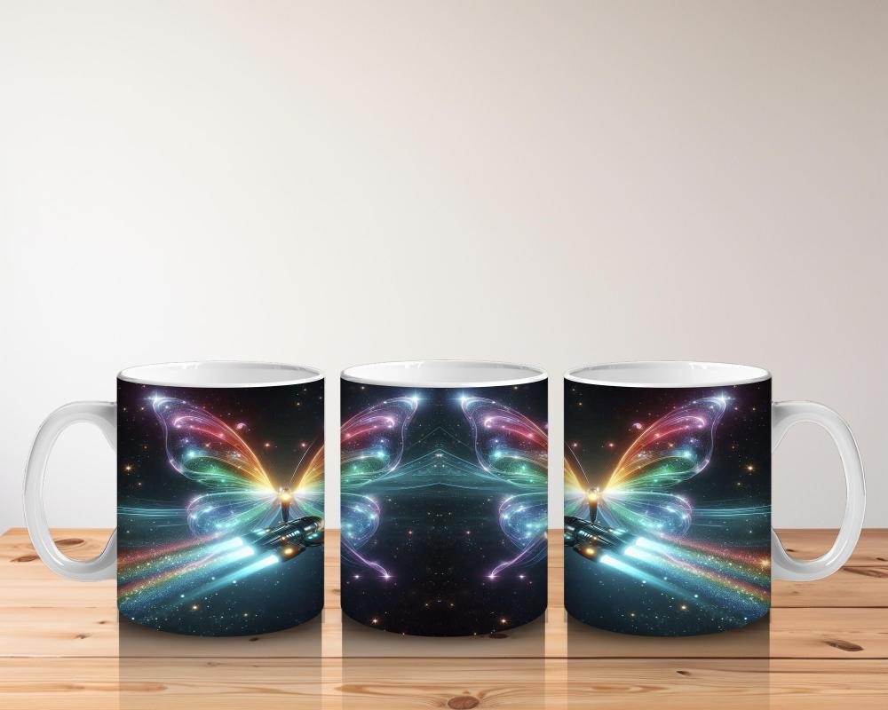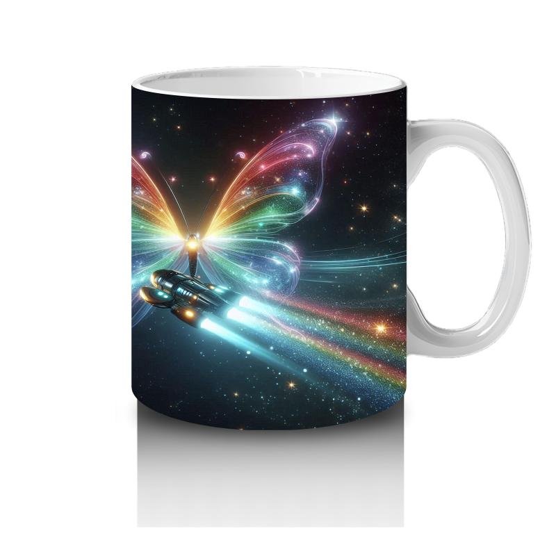 Gökkuşağı kanatlarıyla yıldızlar arasında süzülen bu uzay kelebeği, süt saatini minikler için büyülü bir yolculuğa dönüştürüyor.