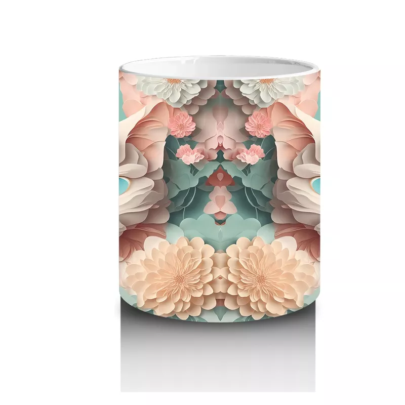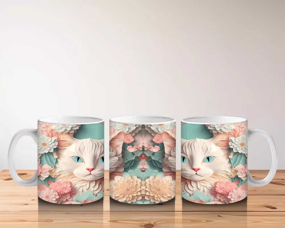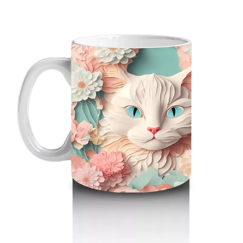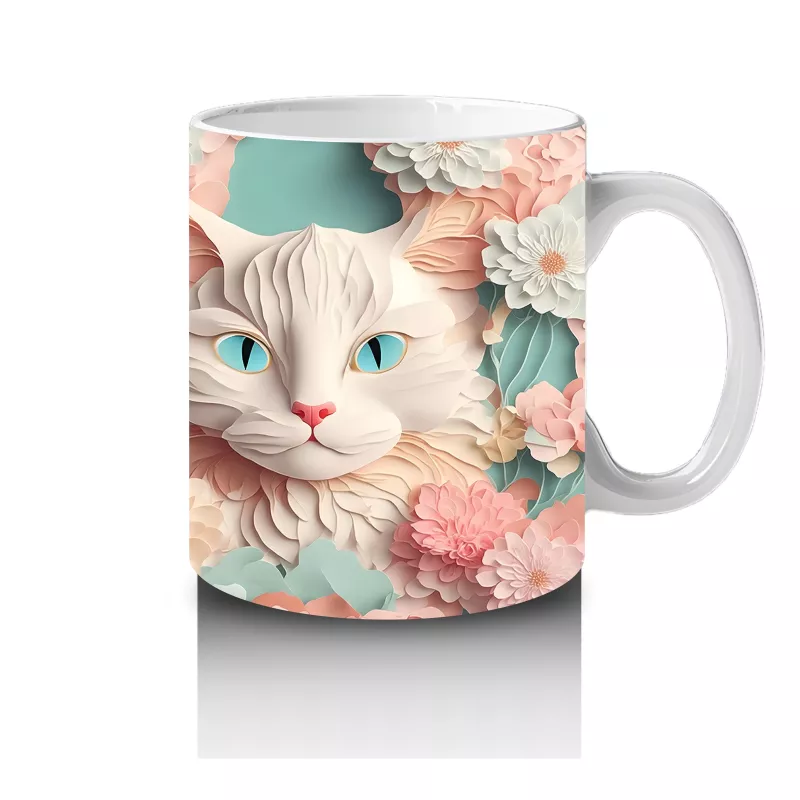 Çiçeklerle çevrili ve ayna efektiyle çoğaltılmış yavru kediler, zarif ve sanatsal bir görünüm sunuyor. Modern ve şık tasarımlar arayanlar için özel bir kupa.