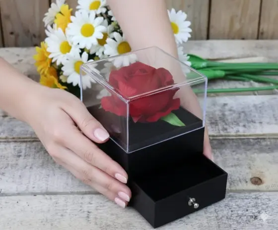 - 💎 Şeffaf Koruma: Kırmızı gülü tozdan koruyan ve her açıdan görünmesini sağlayan kristal netliğinde şeffaf kapak.